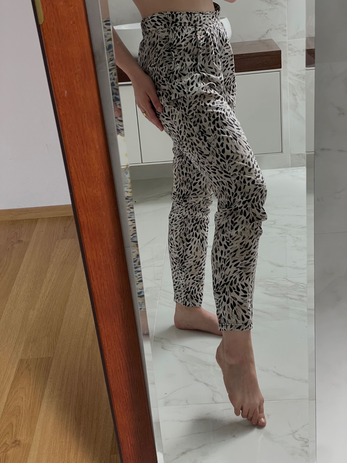 Ľahký a padavý materiál s čierno-bielym vzorom, elastický pás a pohodlný strih robia z týchto nohavíc ideálny letný kúsok. Nohavice nemajú uvedenú veľkosť, no sadnú približne na veľkosť 34/36.