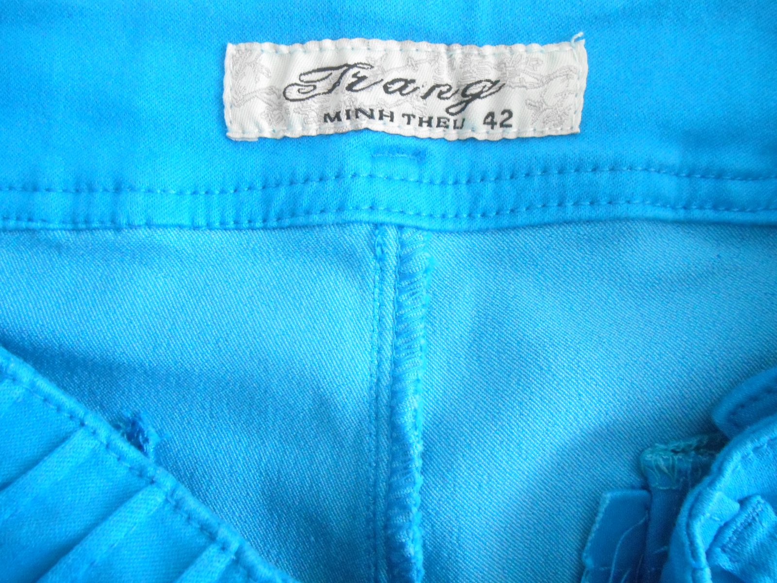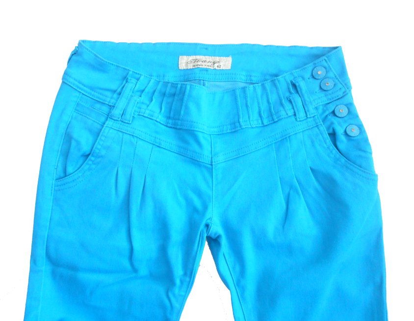 predám dámske nohavice v dobrom nosenom stave, píšu veľkosť 42, značka Trang, materiál: 95% bavlna, 5% lykra, zapínanie na ľavom boku na gombíky, pútka na opasok, dve predné vrecká, dve falošné zadné vrecká, farba medzi modrou a tyrkysovou-nedala sa poriadne zachytiť, v reáli je viac sýta