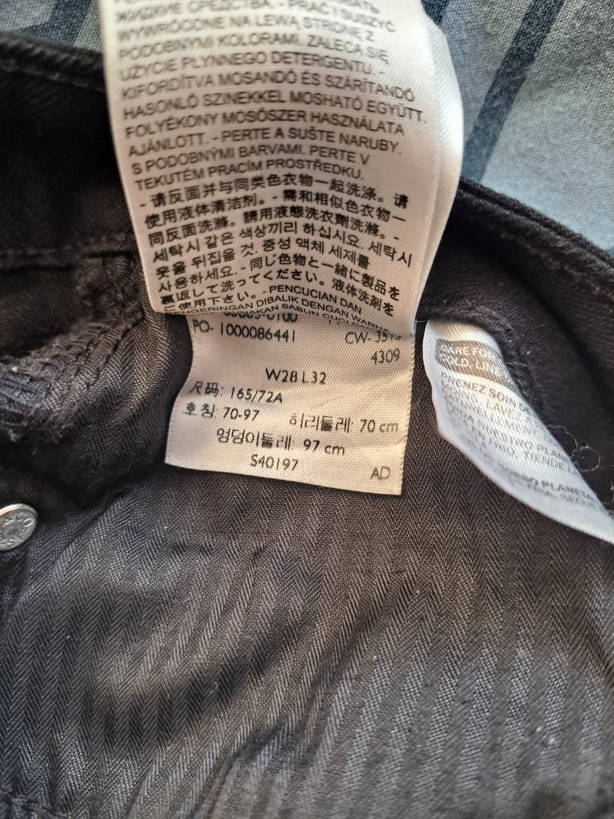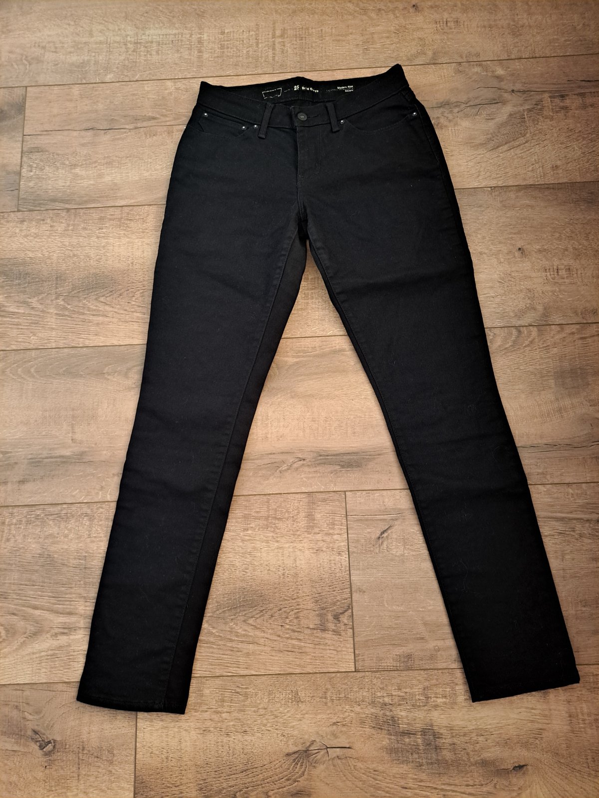 Syto cierne rifle, oblecene par x v top stave. Velkost 28/32 zodpovedaju velkosti S Dlzka 97 cm, vnutorna dl.74, pas 35 cm, stehno pri rozkroku 26 a sirka dole lemi 14 cm.