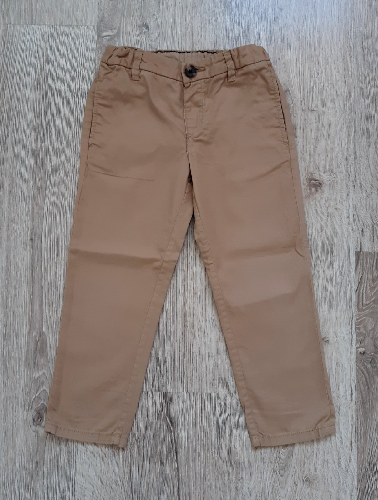 Mrkvové chino nohavice vo veľmi dobrom nosenom stave (iba párkrát oblečené; bez dierok, fliačikov a žmolkov; 1 výrobná vada na zadnej strane ľavého stehna (detail viď foto č. 3)). Nohavice majú klasický strih; nastaviteľnú gumu v páse; 2 otvorené predné + 1 falošné zadné vrecko; zapínanie na gombík. Značka: H&M (odstrihnuté vnútorné štítky); veľkosť: 104 (3 - 4 roky). Celková zadná dĺžka: 57,5 cm.