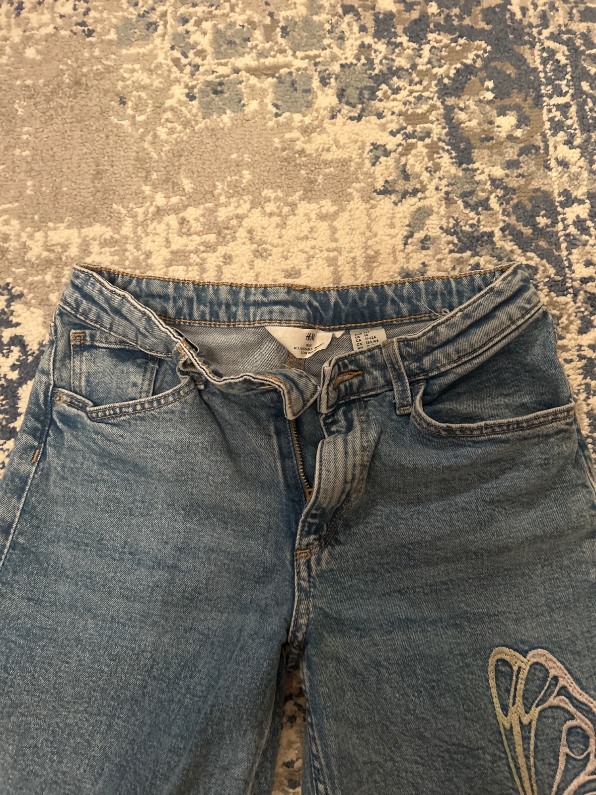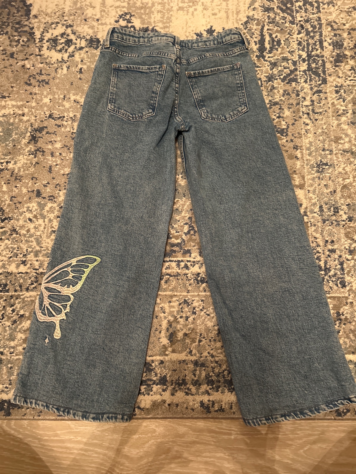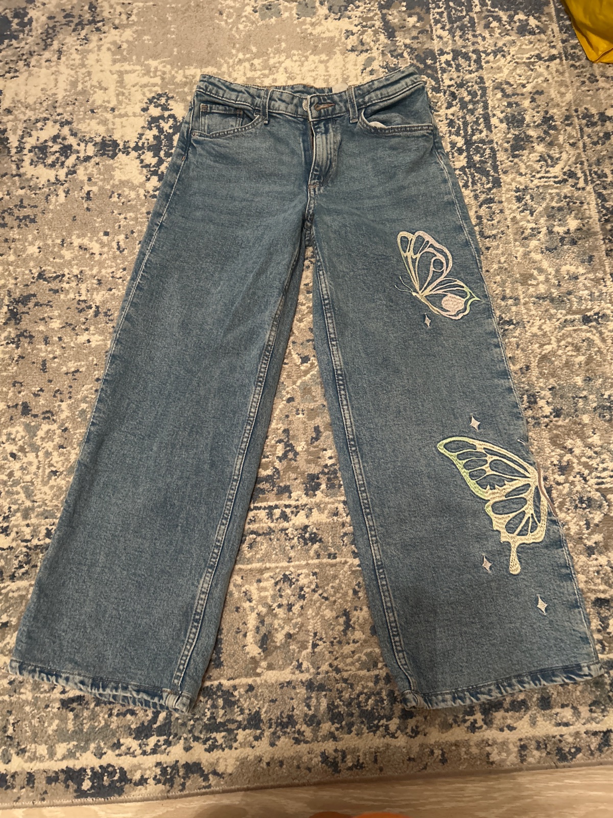 Rifle širokého strihu s vyšitymi motýľom. Veľkosť 152, boli skracovane, na širšiu postavu. Pas 66cm, dĺžka 78cm.