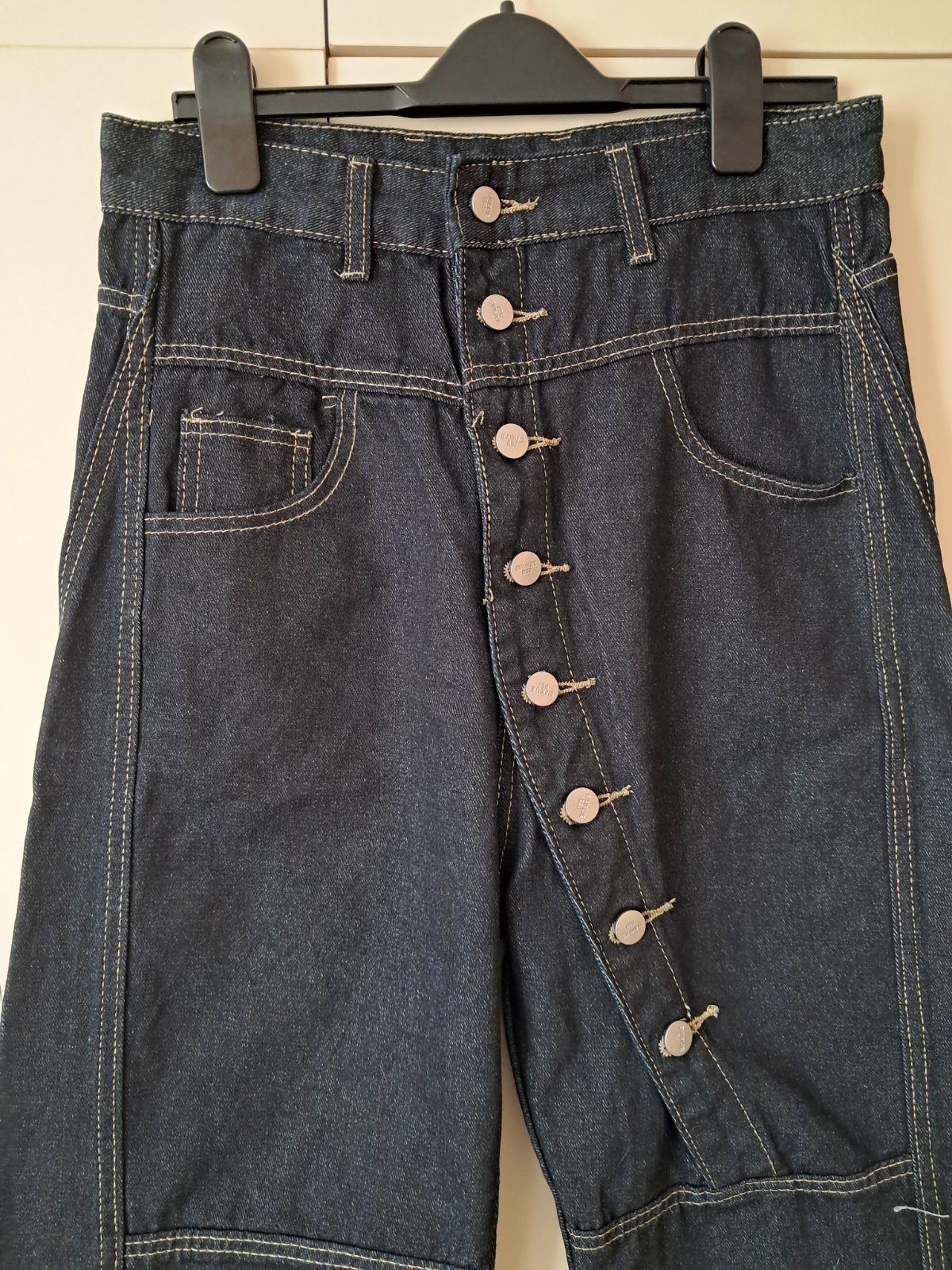 Predám nové rifle s vysokým pásom a netradičným zapínaním. Širka v páse 38, dlžka 99cm.
