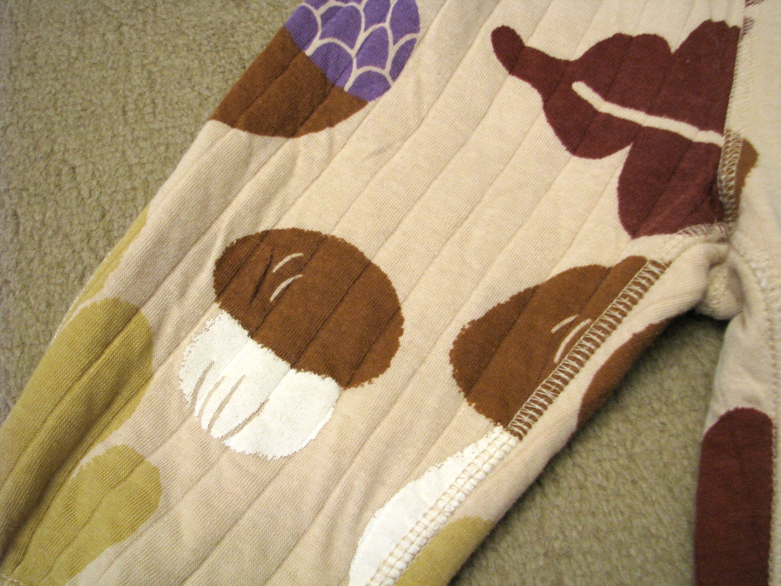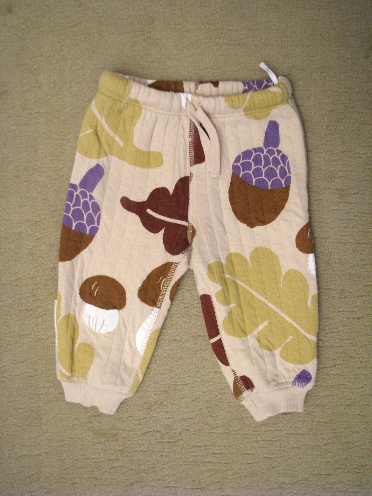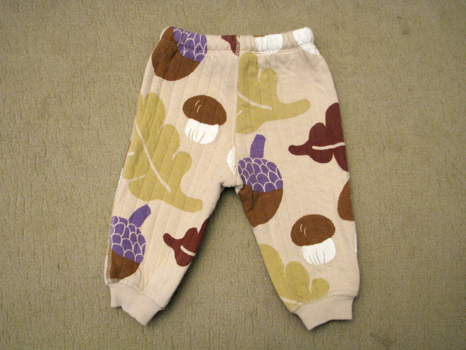 Teplé, hrubé tepláky pre bábätko s lesnou potlačou hríbikov a listov. Pekne zachovalé, bez poškodení. Veľkosť len veľmi nahrubo odhadujem, v prípade záujmu ma prosím radšej požiadajte o premeranie.