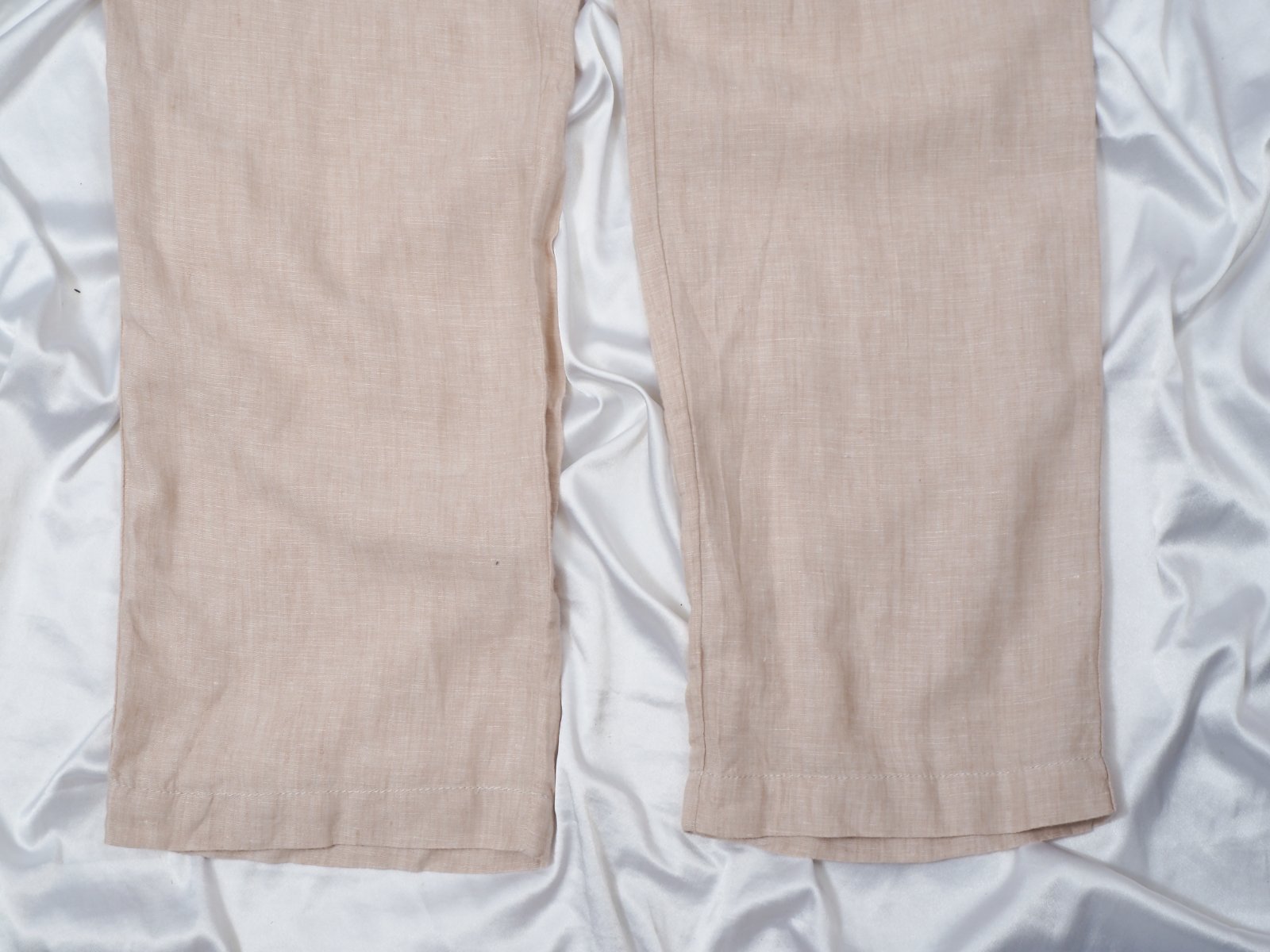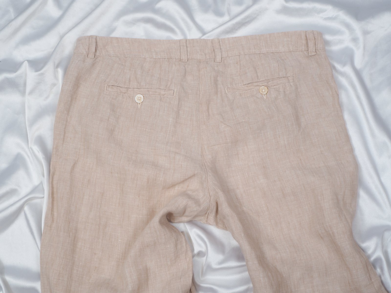 Kvalitné béžové ľanové nohavice, zapínanie na zips a 2 háčiky, materiál 100% ľan, super stav.
