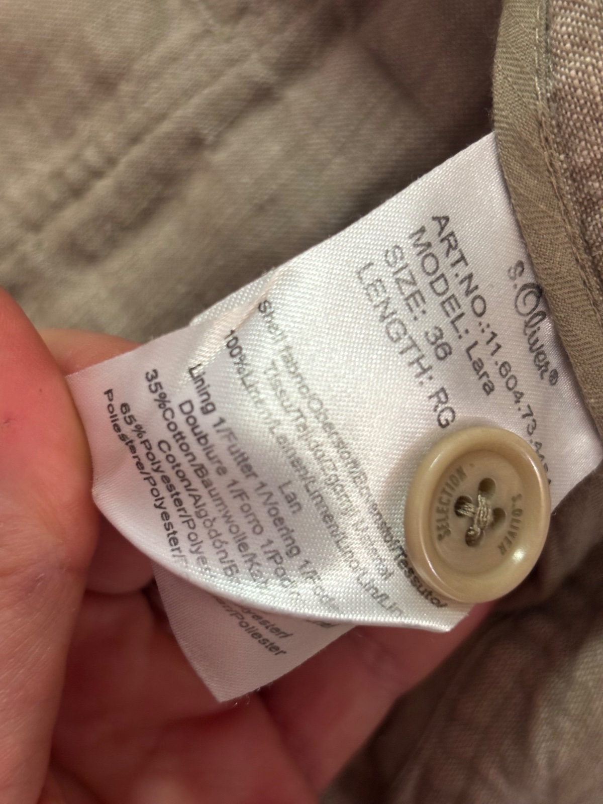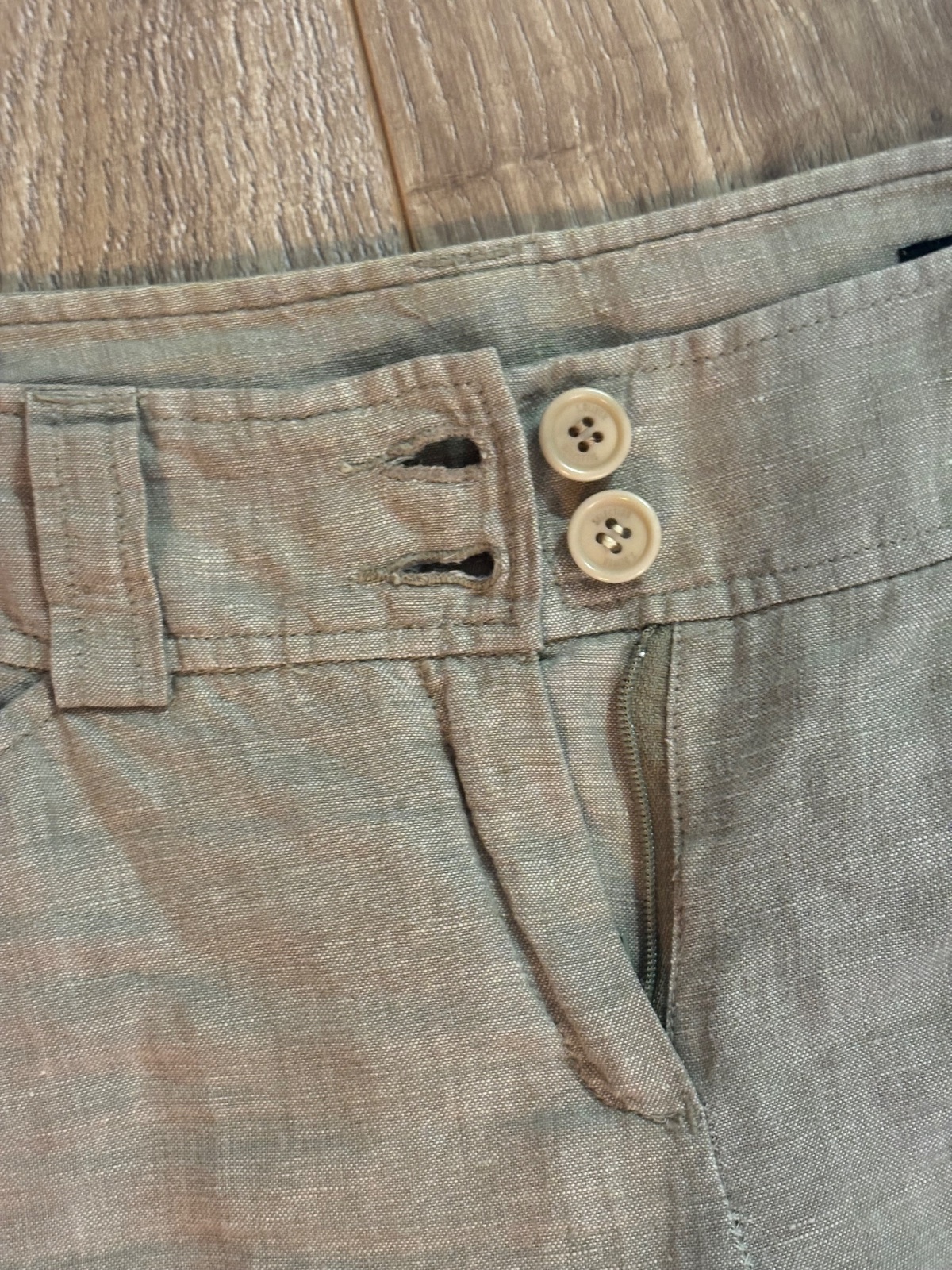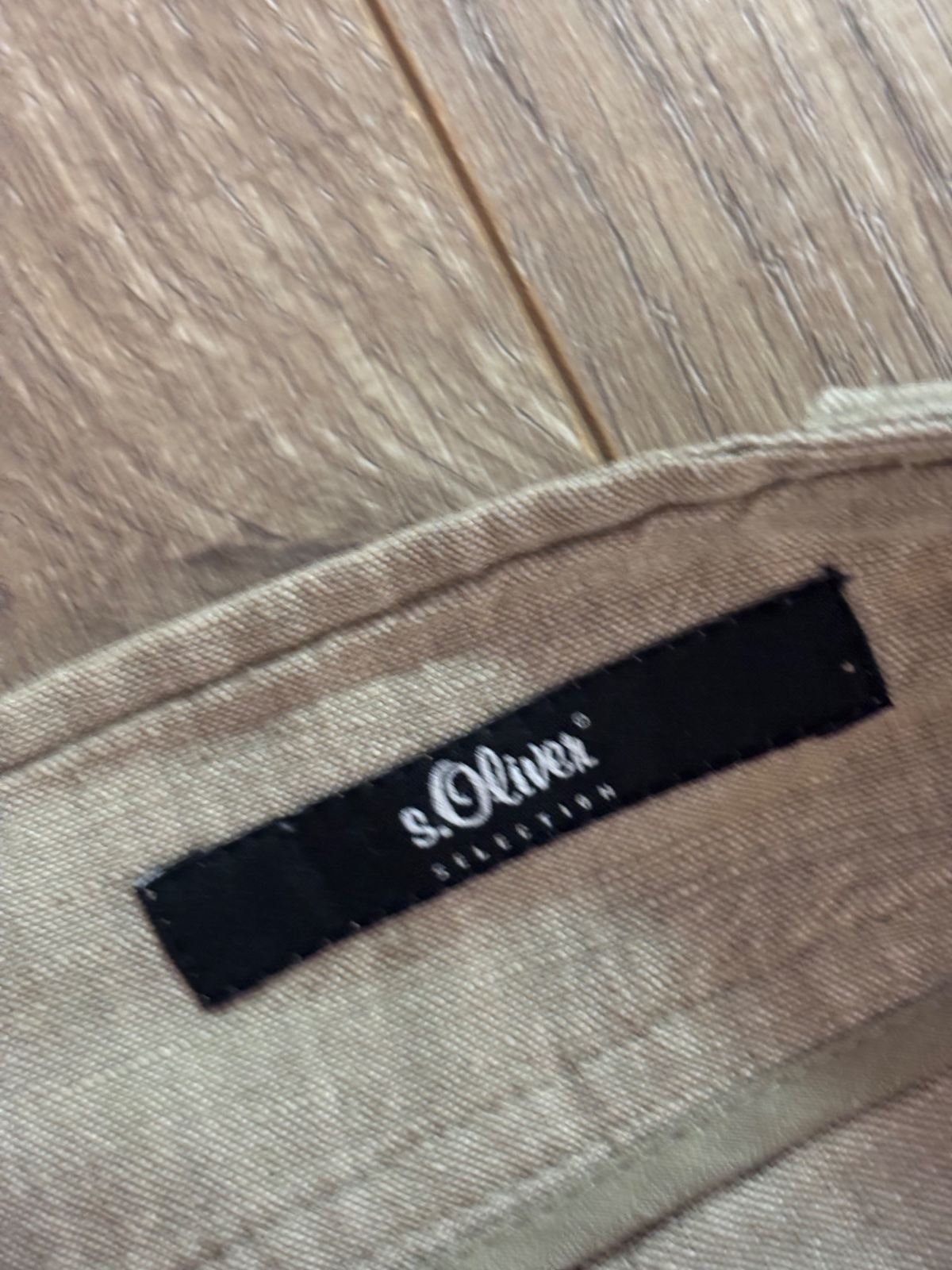 Pekné nohavice na štýl rifle, vhodné aj na leto, lebo su taka príjemná látka, ozdobné zapínanie na gombiky vpredu namiesto zipsu a prešitie cez nohy; Veľkosť medzi 36/38.