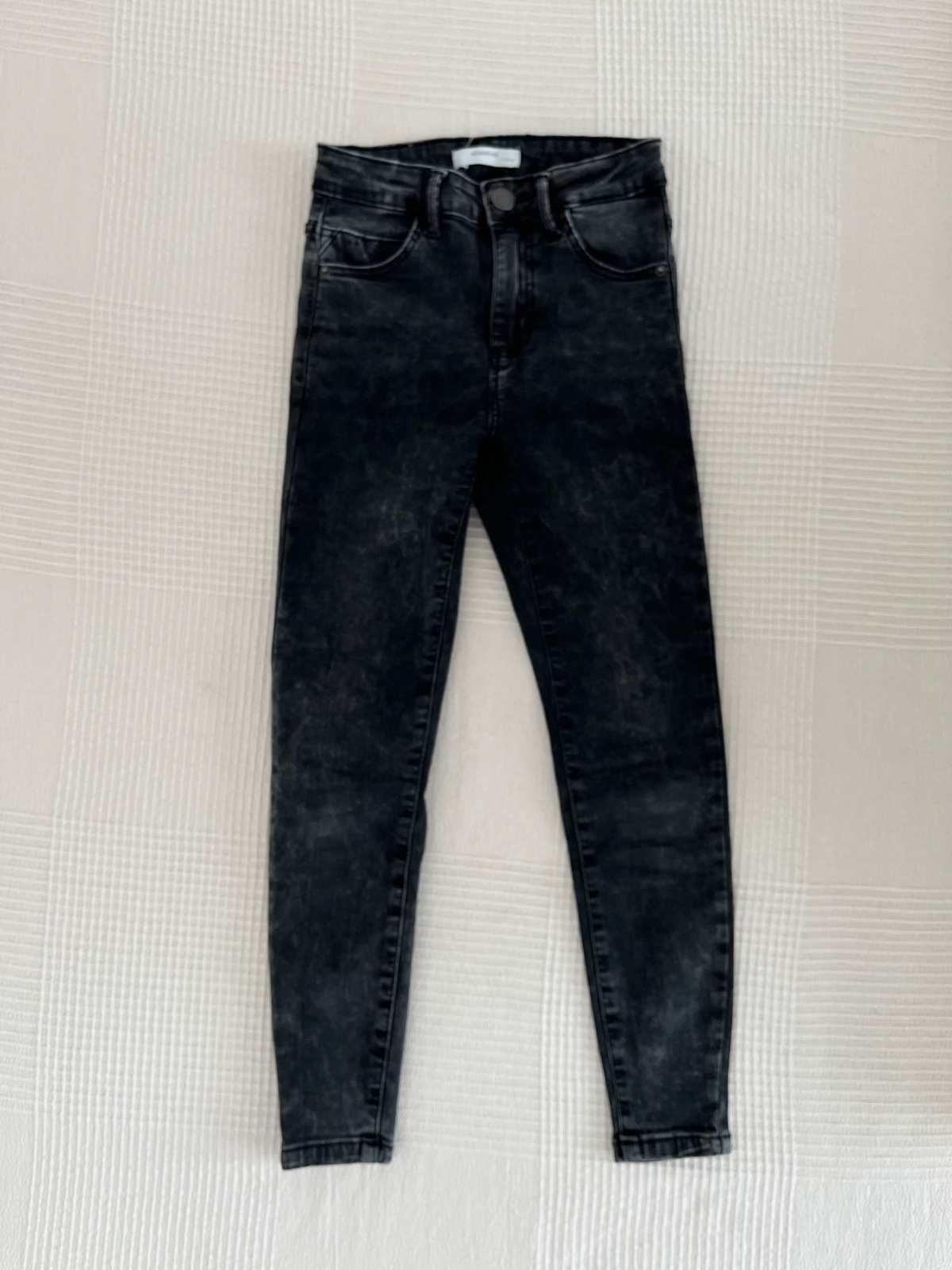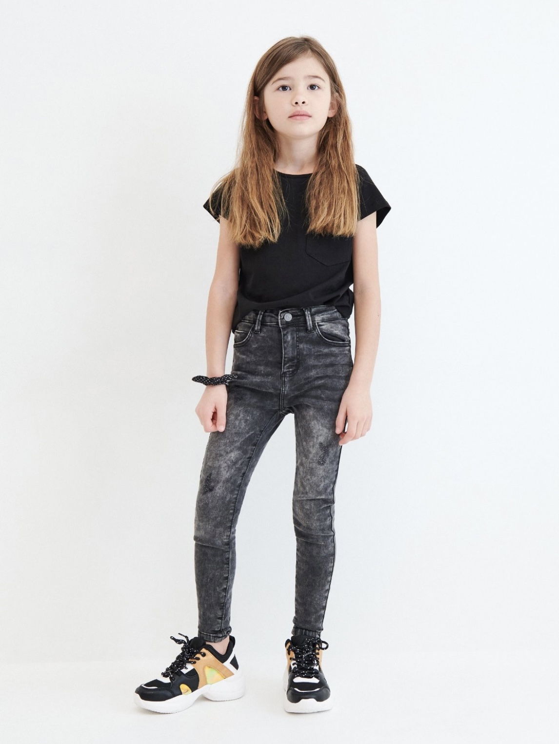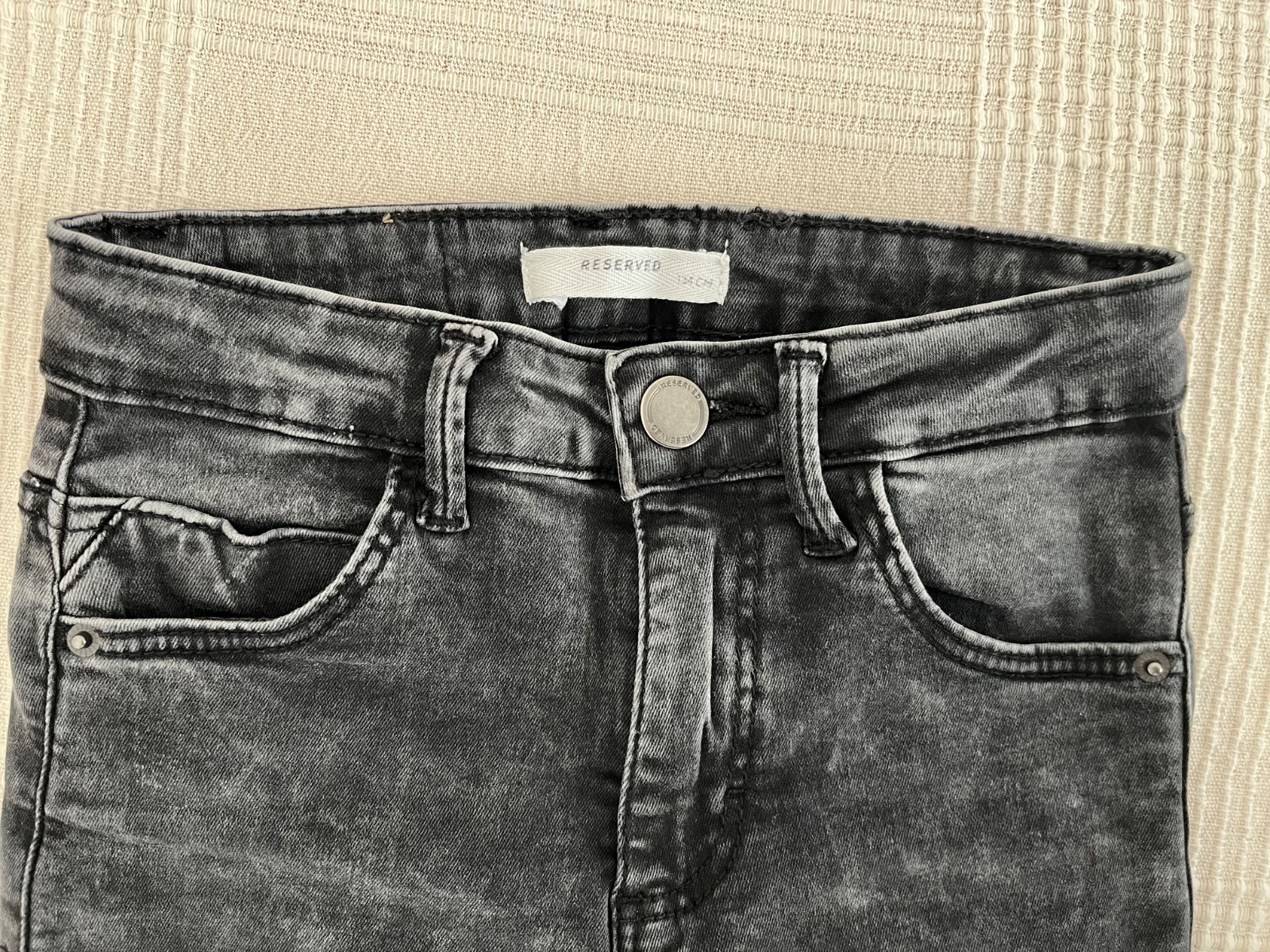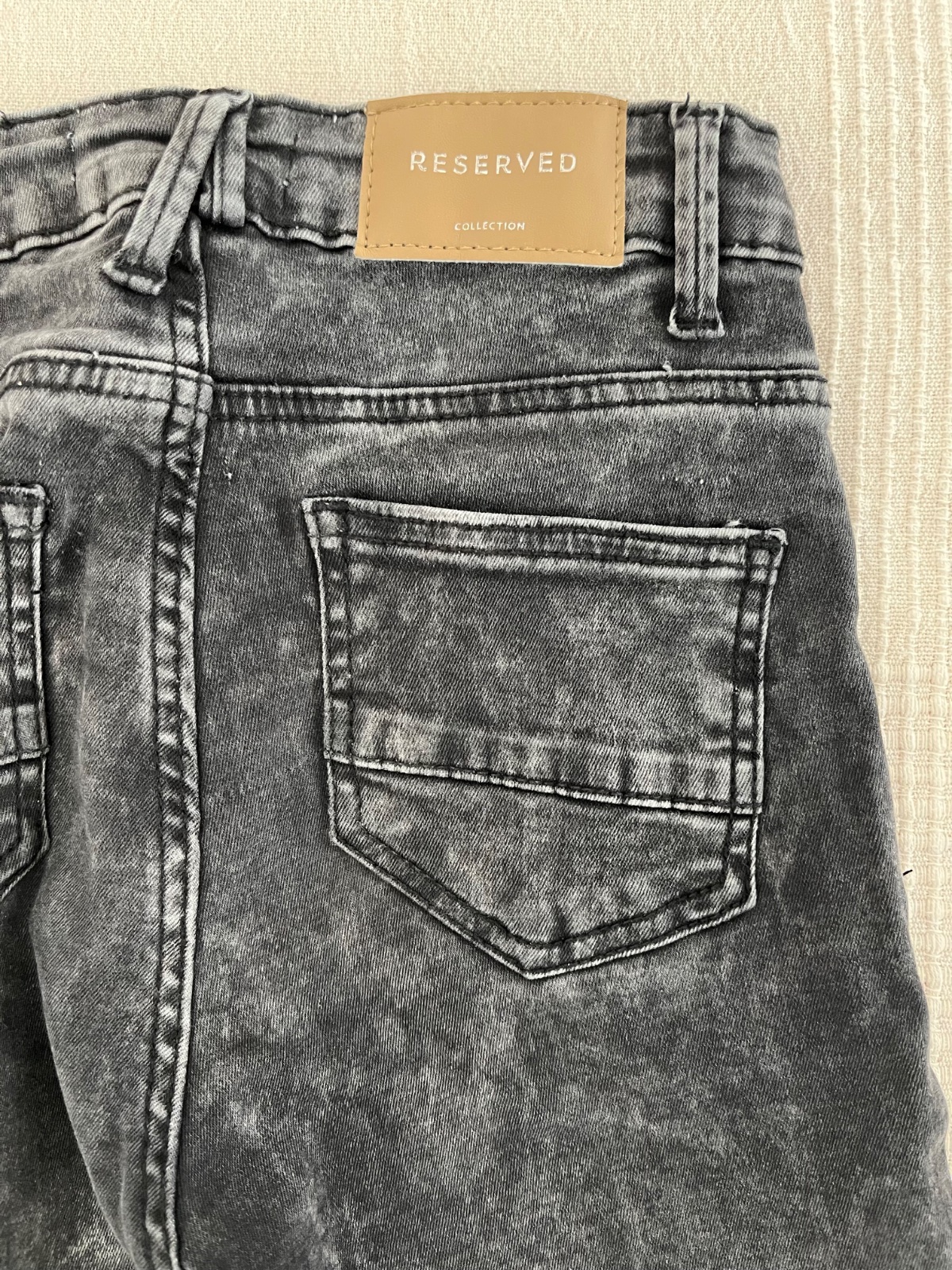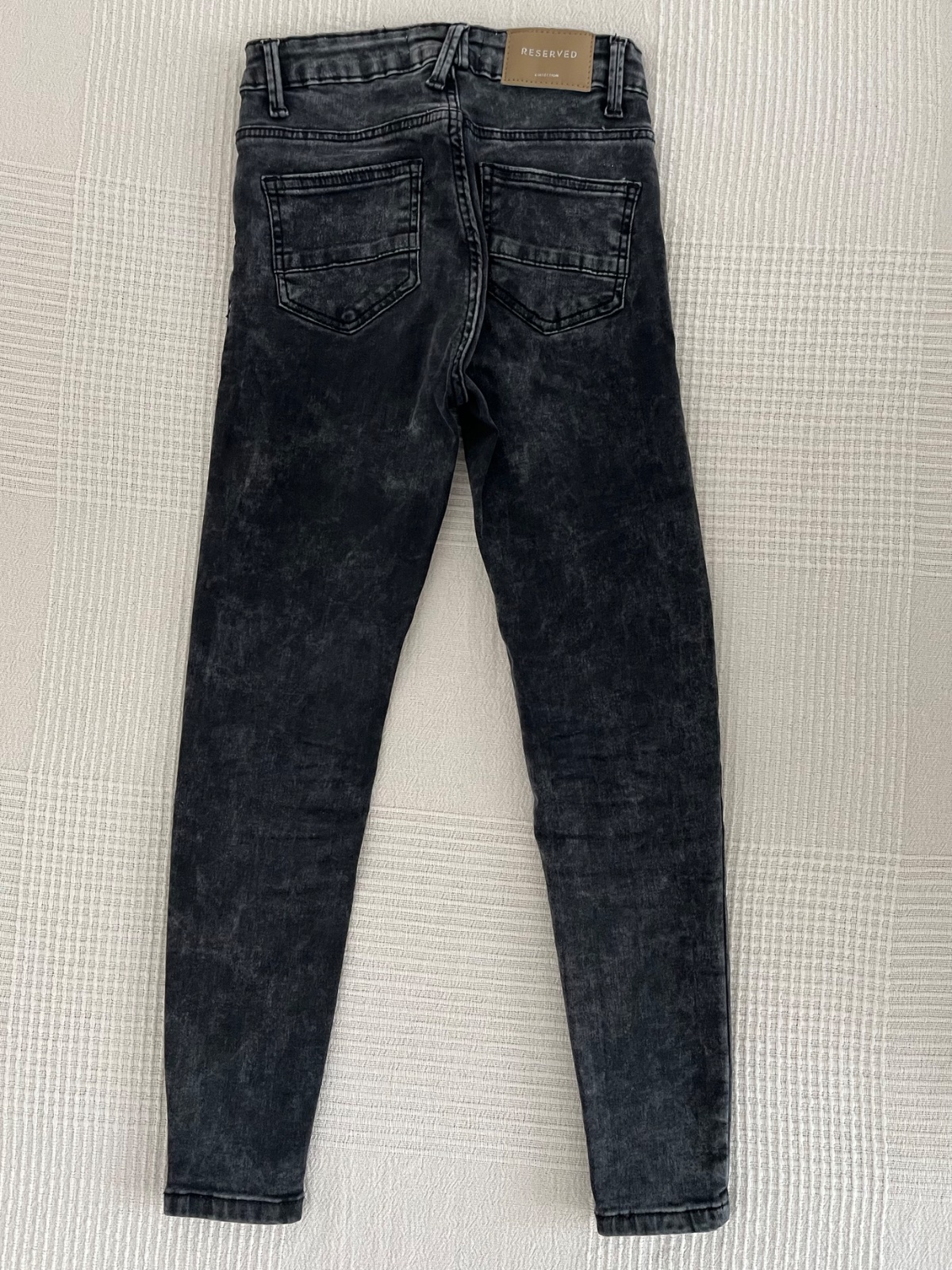 TOP STAV - Stylove slimkove rifle zn. Reserved,velkost 134, sadnu aj uplnej spagetke.Kupovane nove a nosene iba mojou dcerkou do skoly.Su v top stave, bez poskodeni. Pas je stahovaci. Riflovina je pruzna,riflicky su pohodlne, dcerka ich mala v dvoch farbach.
