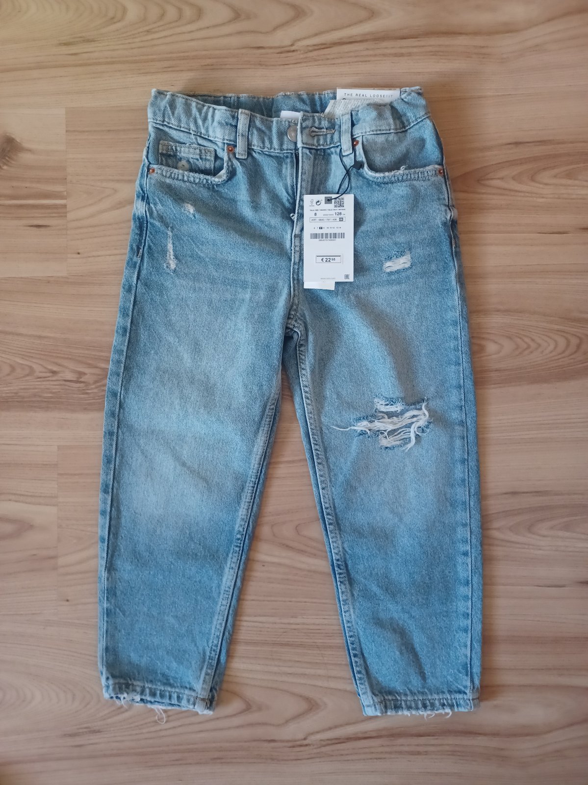 Krásne rifle veľkosť 128,možno 122 malému sú veľké ináč nádherné sedia...sú to loose fit dziny ...pas 32cm dá sa regulovať,dĺžka 68cm 😊...nové