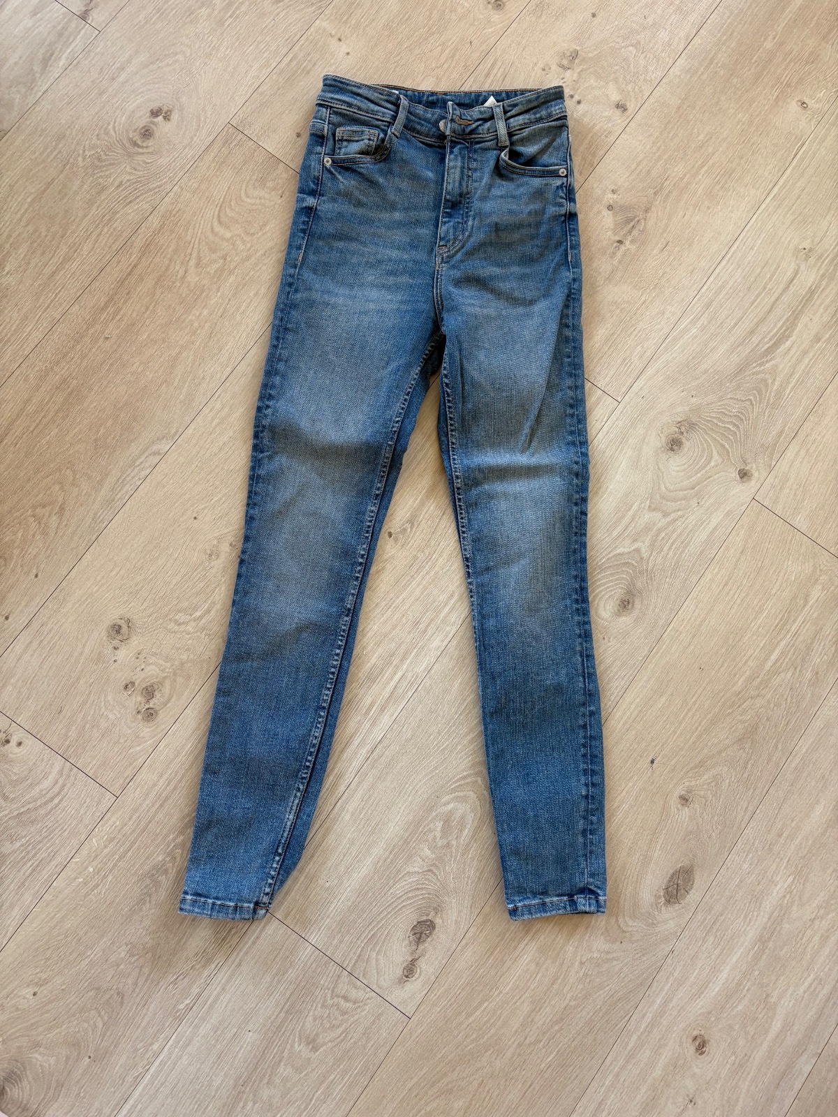 Dámske obtiahnuté rozrhané rifle. Stredne vysoký pás. Veľkosť 34 čiže XS. Značka Zara.