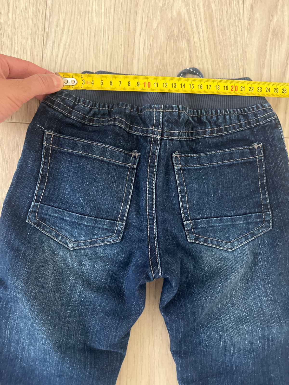 Džínsové tepláky po jednom dieťati v TOP stave. Píše veľkosť 116, ale skôr by som povedala 110. Hlavne na dĺžku. Farba je skôr taká ako na poslednej fotke, tmavšie modrá, veľmi pekná. Nepodarilo sa...