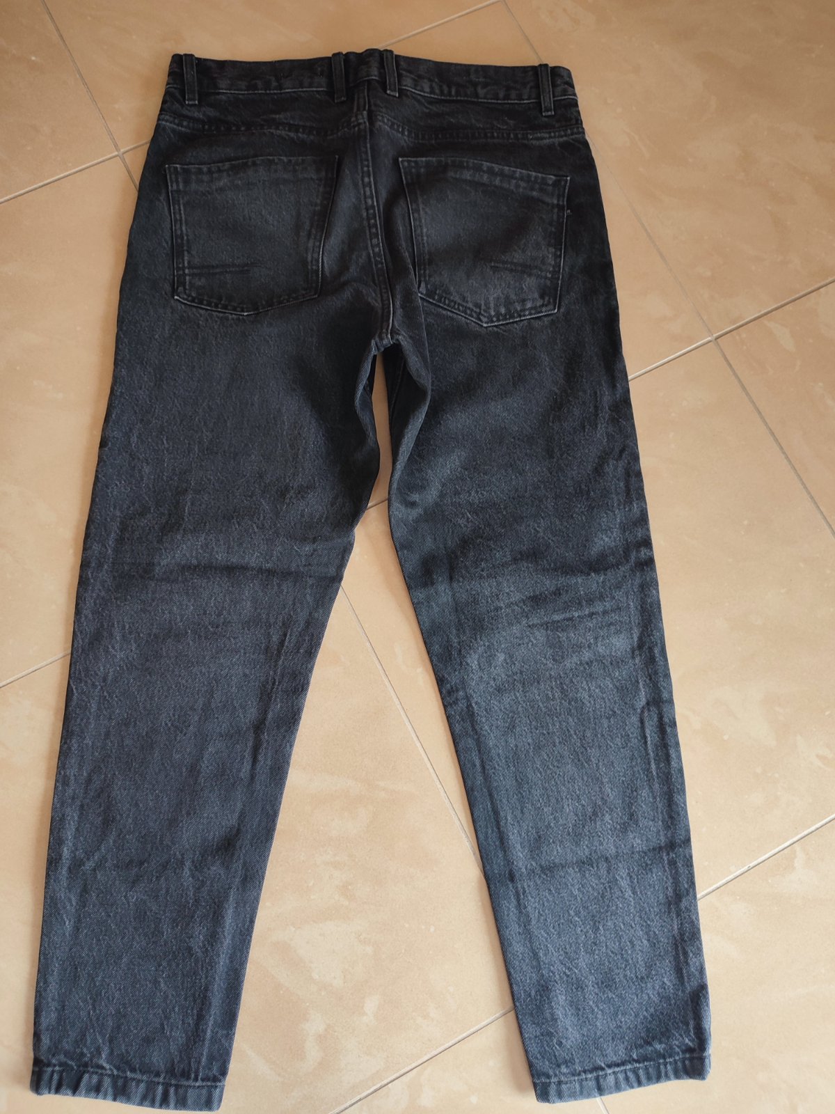 tmavo-modré rifle nosené raz, dole majú gumičku ako patent, v páse je gumička na stiahnutie, v kľude pás: 40 cm x 2, po natiahnutí: 46 cm x 2, vonkajšia dlžka: 94 cm, vnútorná dlžka: 67 cm, výborn...