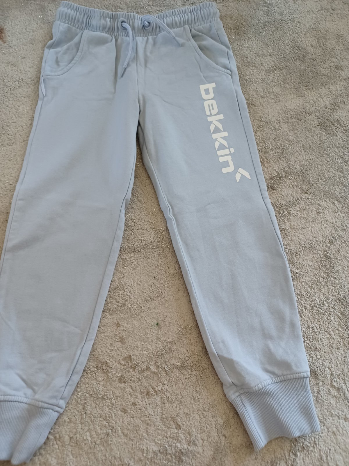 Už len jedny modré tepláčiky so stuhou na stiahnutie pása značky pepco. Jedny sú veľkosť 116 celková dĺžka 70 cm, pás 21,5 cm. Tepláčiky sú zakončené gumou. Majú žmolky ale nemajú žiadne fľaky a...