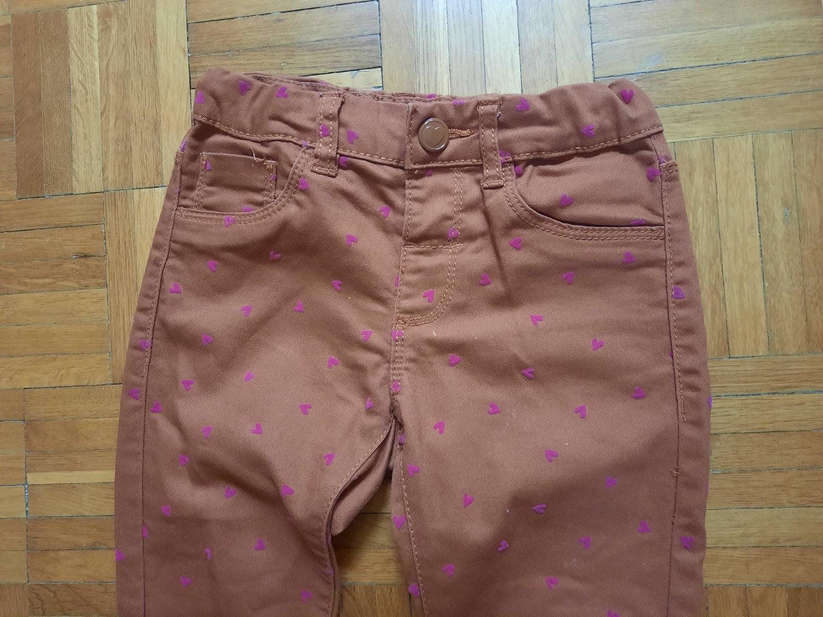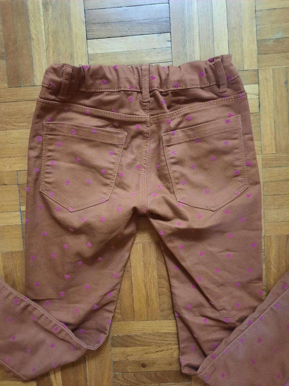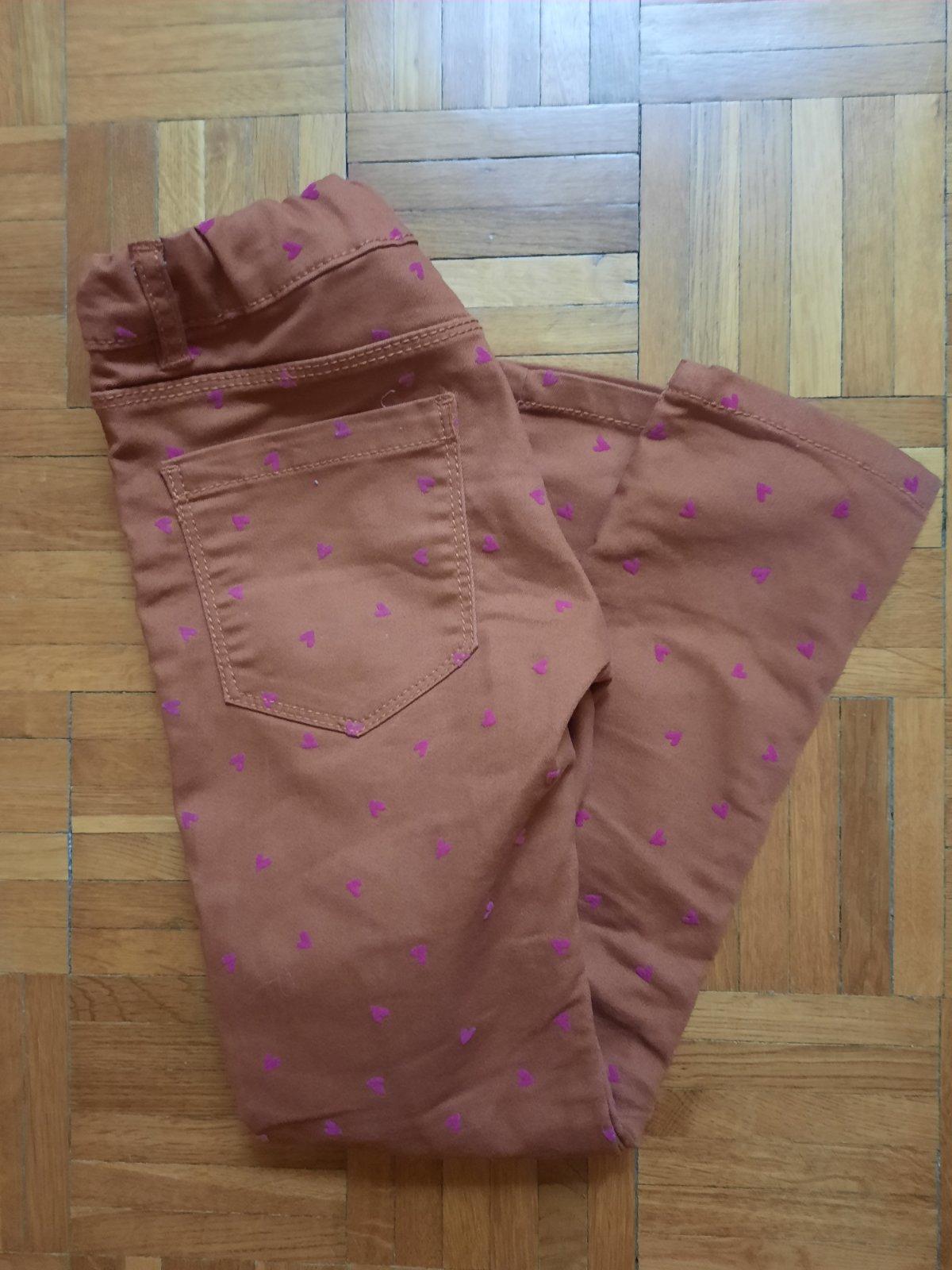 Veľmi pekné úzke nohavice so srdiečkami. V páse je guma na reguláciu. Vačky vzadu sú funkčné, vpredu iba ozdobné. Farba je tehlová/ ako hrdza. Veľmi dobrý stav.