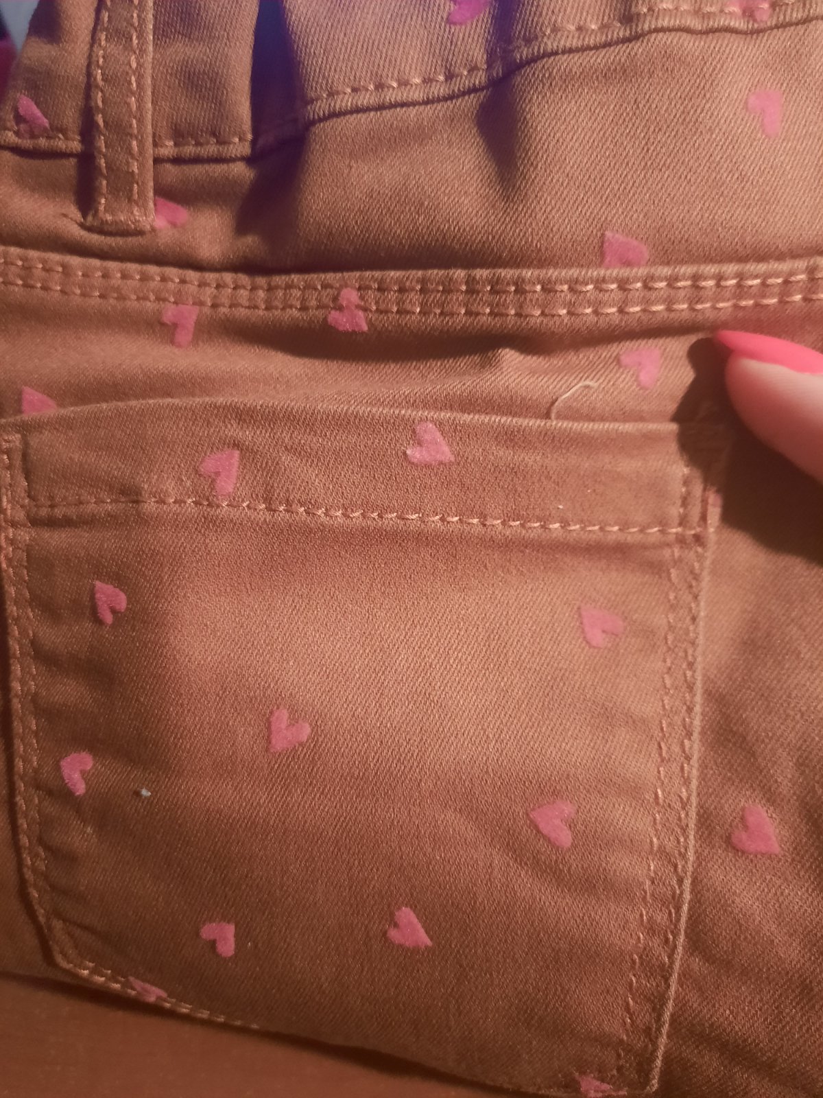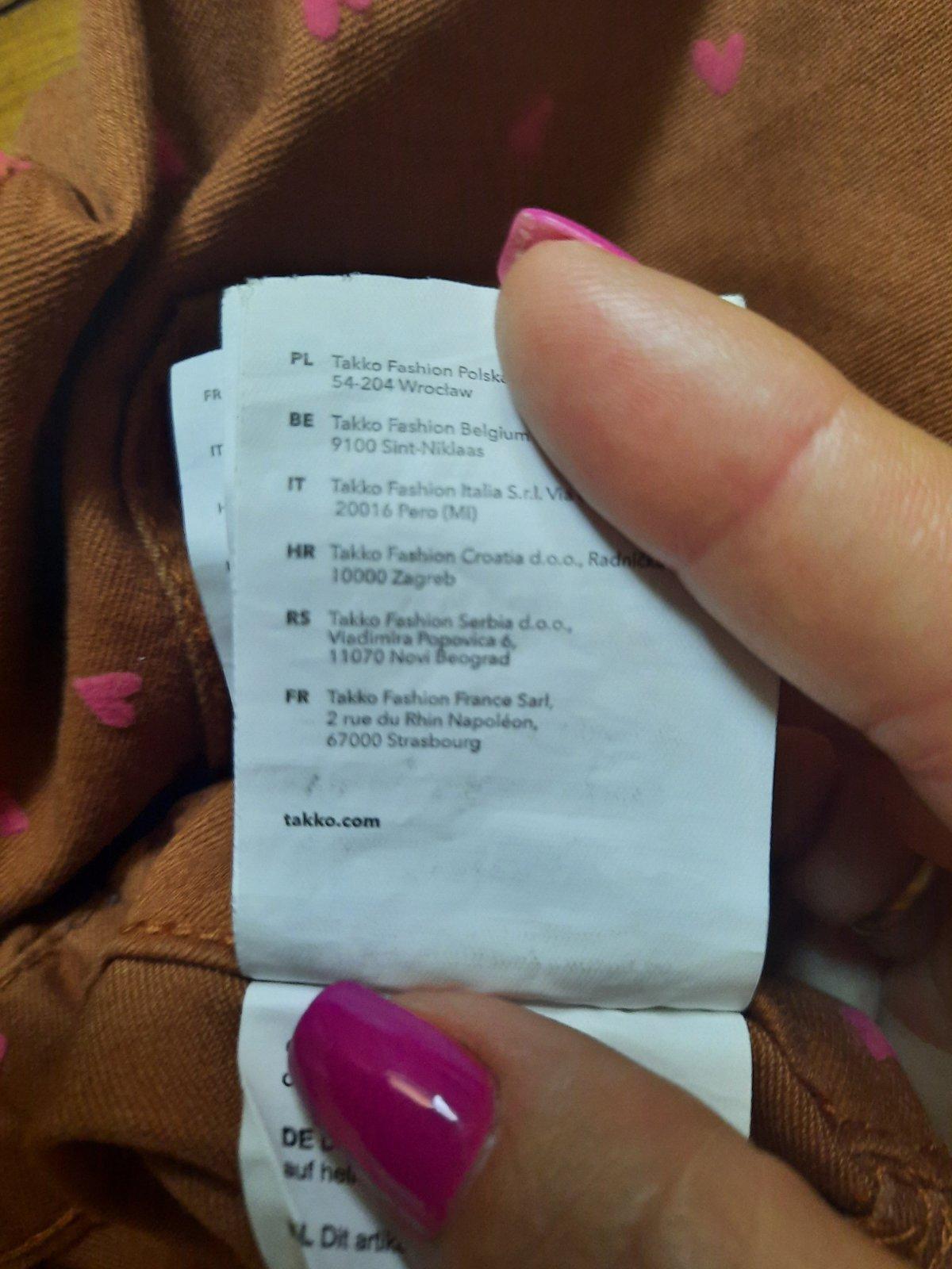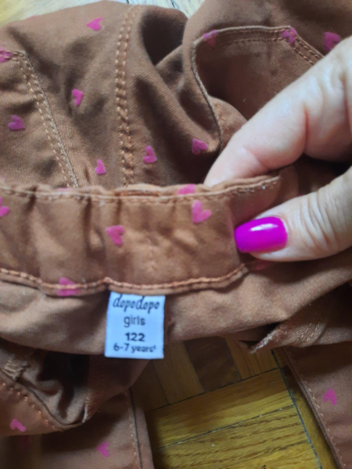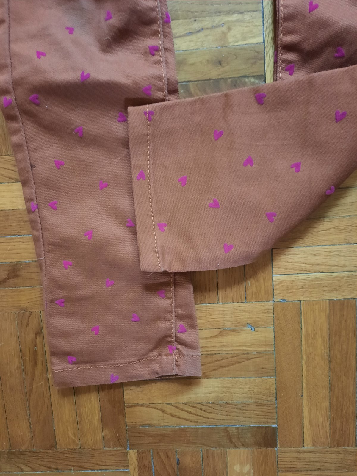 Veľmi pekné úzke nohavice so srdiečkami. V páse je guma na reguláciu. Vačky vzadu sú funkčné, vpredu iba ozdobné. Farba je tehlová/ ako hrdza. Veľmi dobrý stav.
