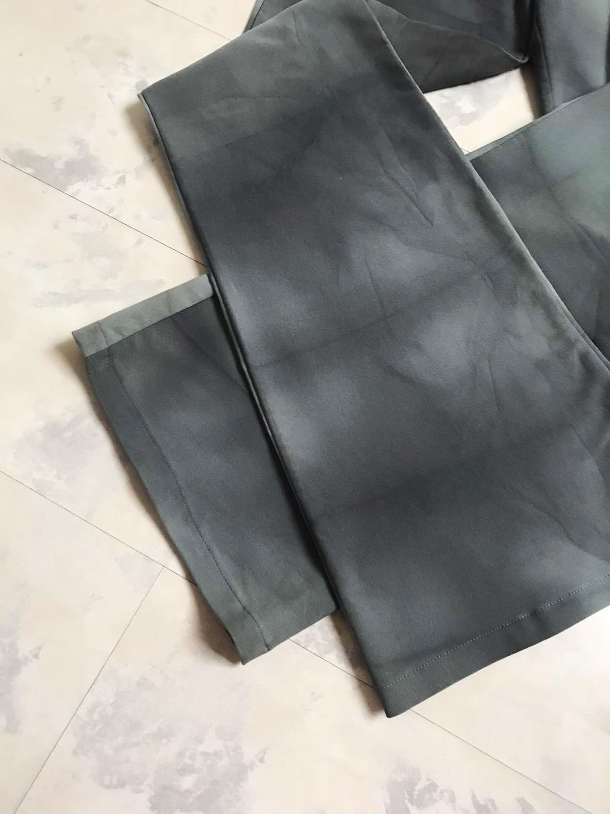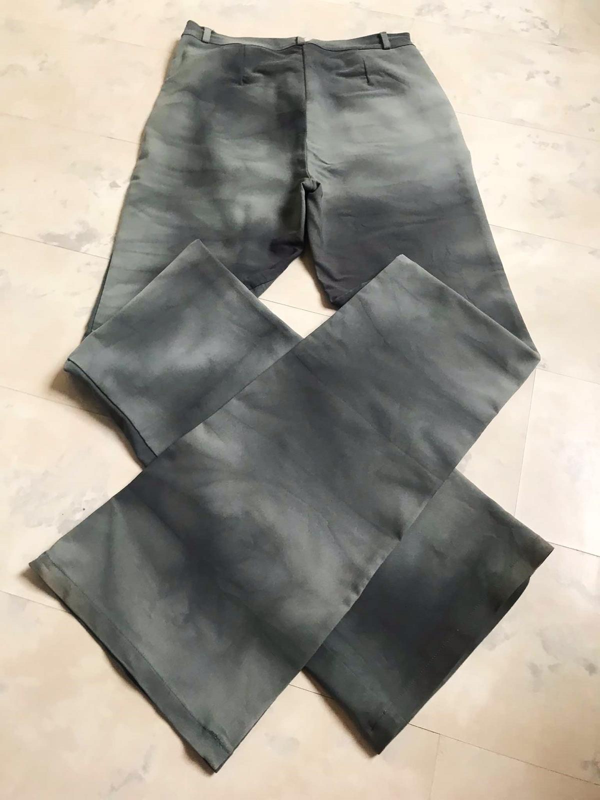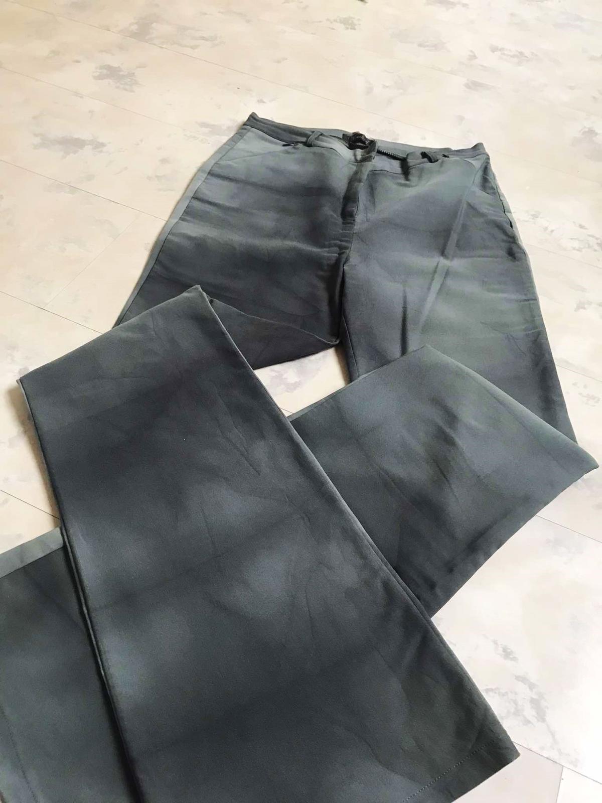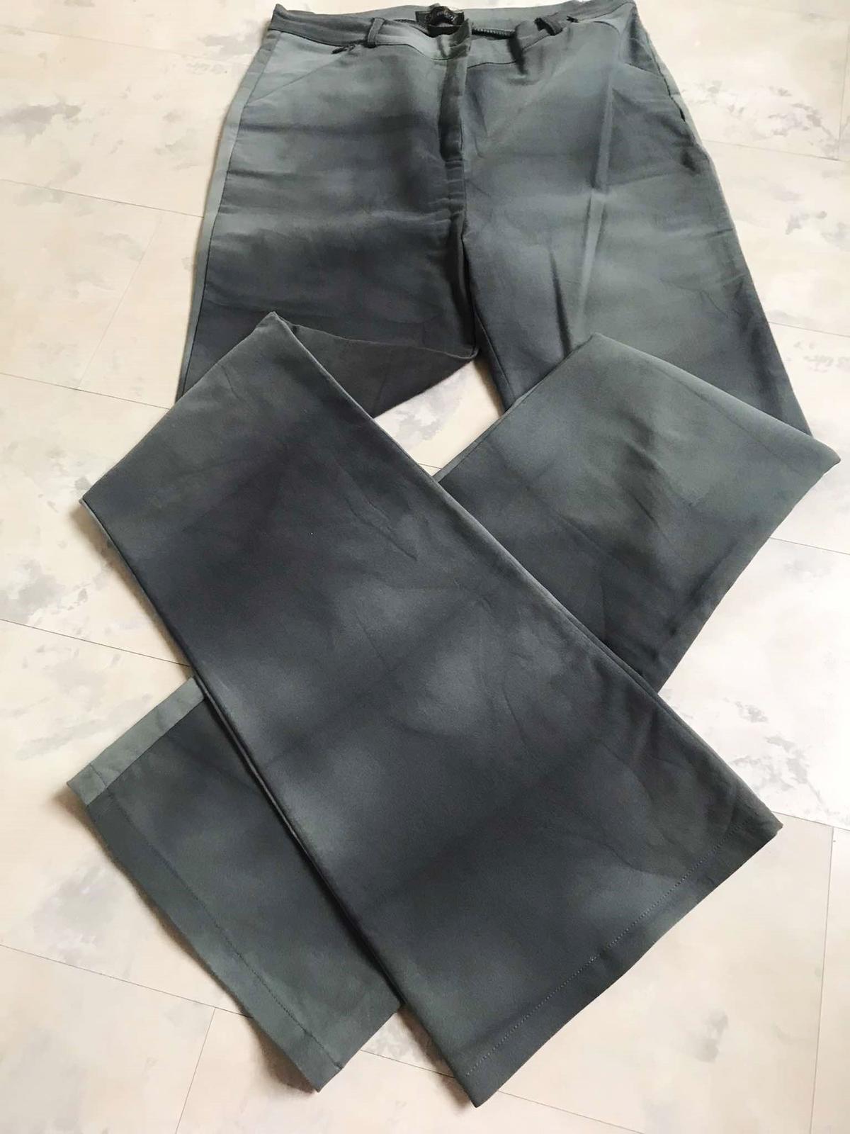 perfektne sadnúce min.nosené trendové nohavice s vysokým pásom,dole široké,vpredu zaujímavo šité vrecká,farba je sivá jemne do olivovej - tieňovaná - batikovaná,sú pružné - pekne sa prispôsobia postave,nekrčia sa a držia formu