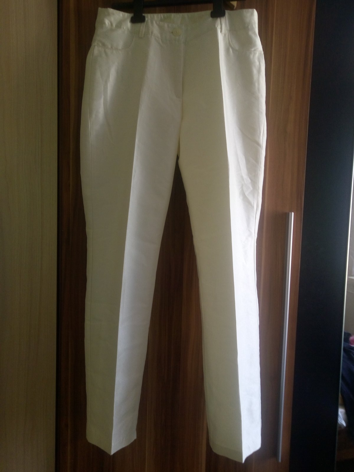 Farba krémova so zlatým jemným odleskom. Pevnejšia látka podobná riflovine . V nosenom bezchybnom stave. Pás 84 cm, dĺžka nohavic 103 cm