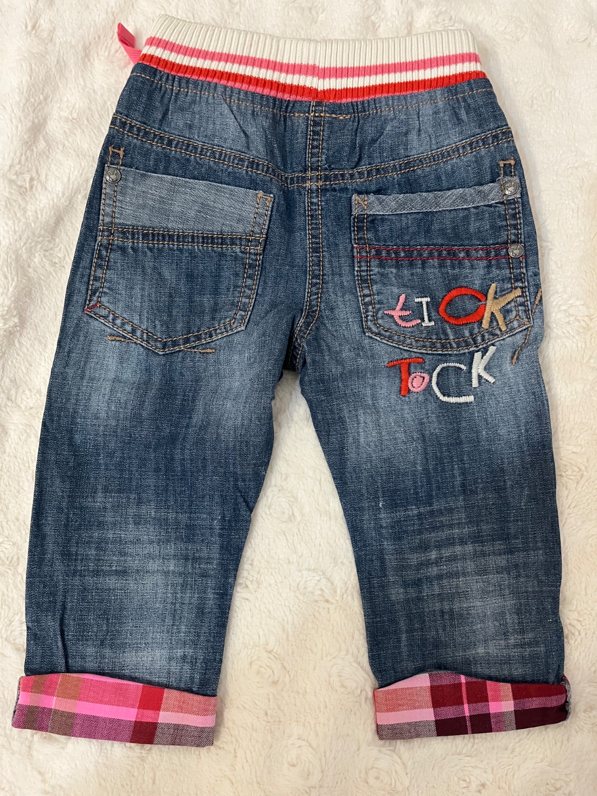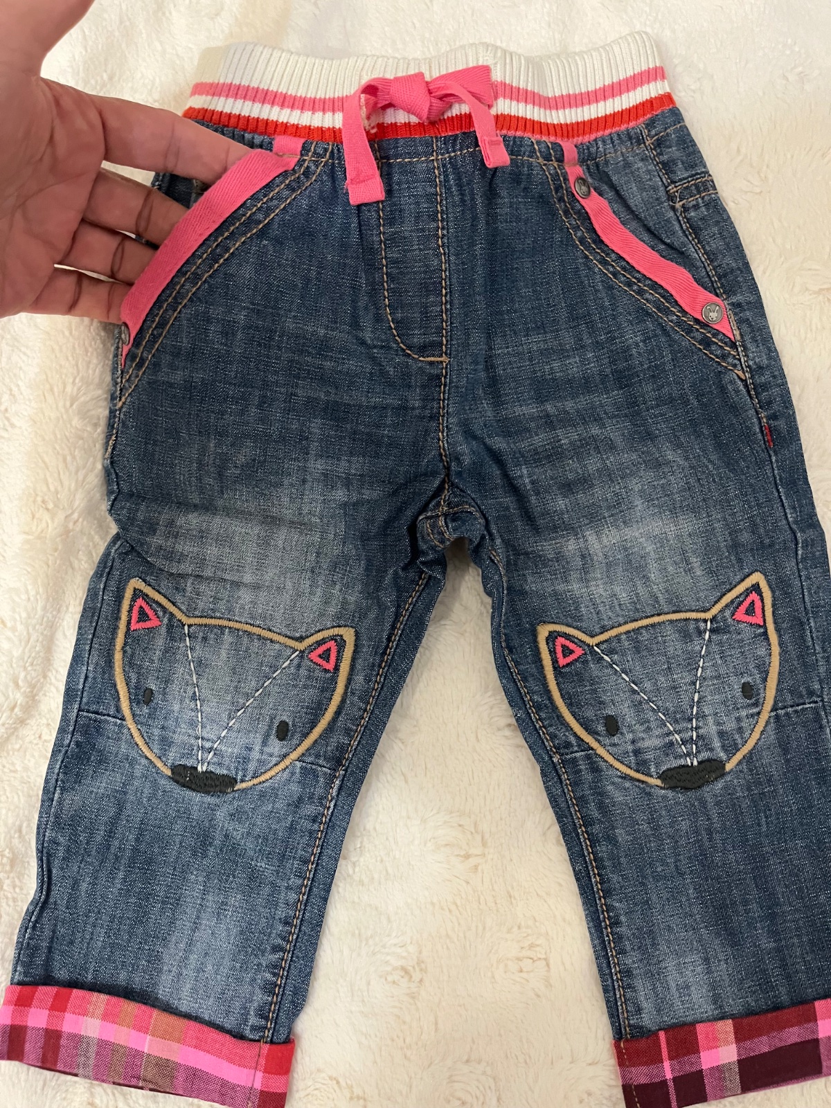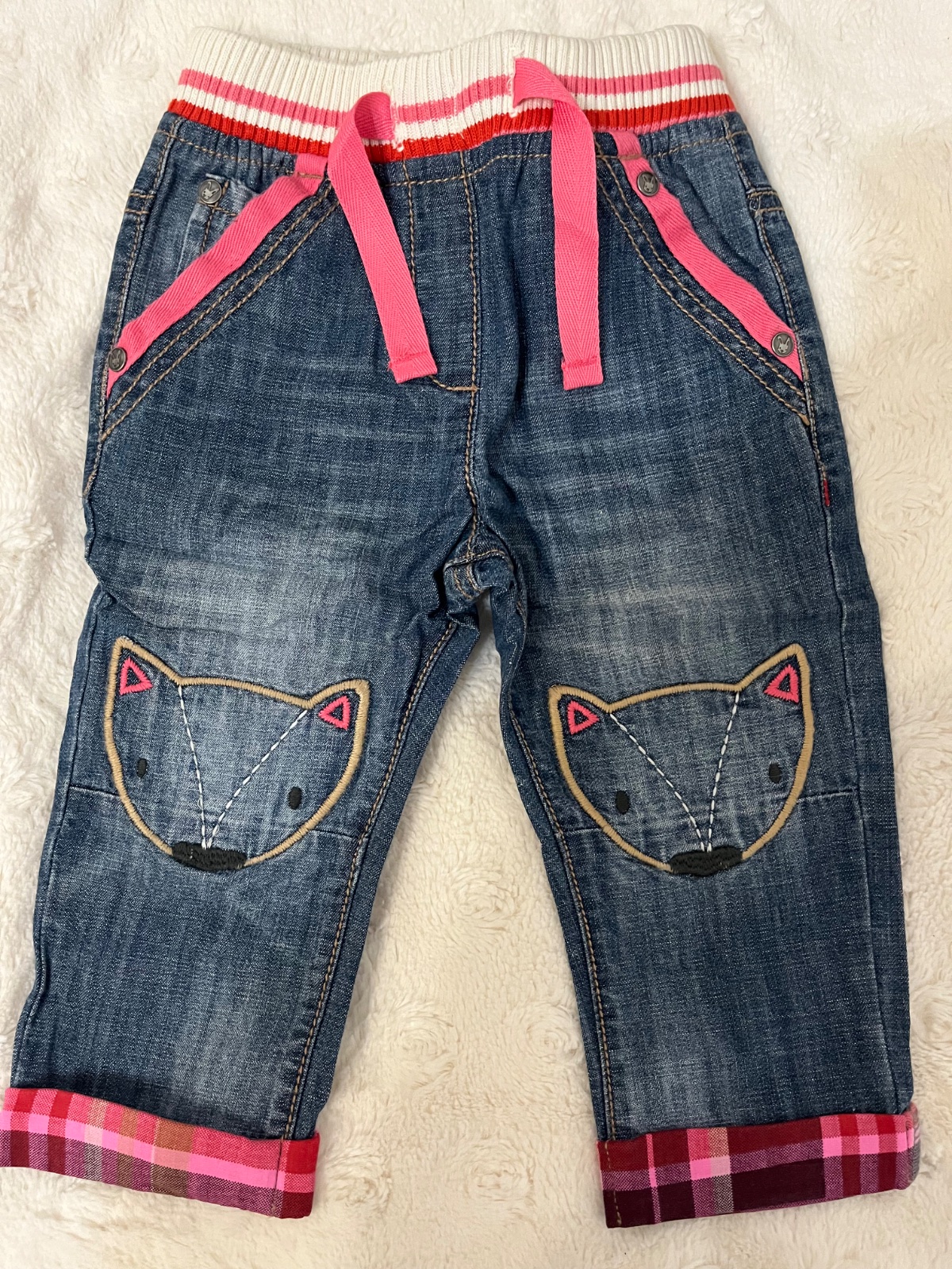 Rifle veľkosť na 9-12 mesiacov . Pekne detaily . Materiál mäkká riflovina. Super stav