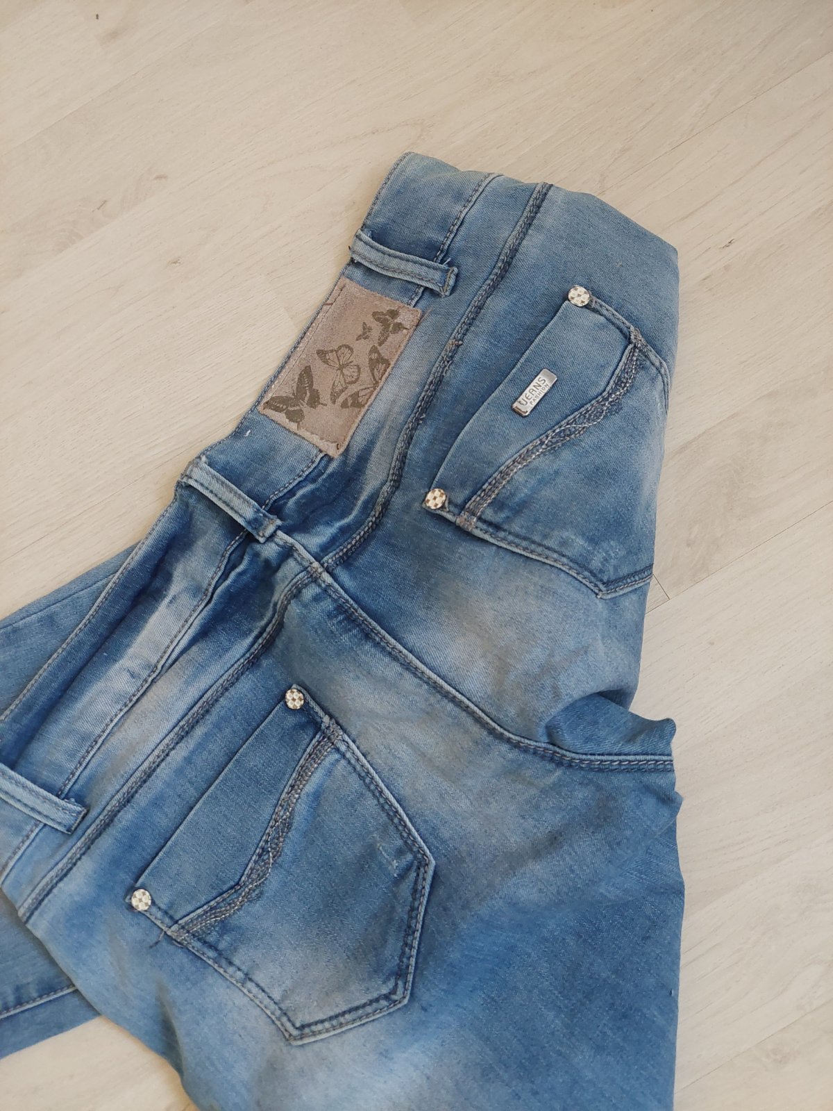 Bledomodré rifle s vypraným efektom, bez poškodenia, výborný stav. Dĺžka 105 cm.