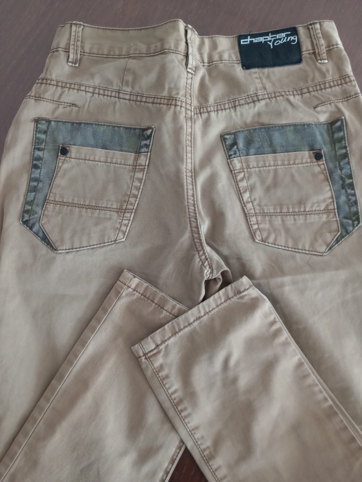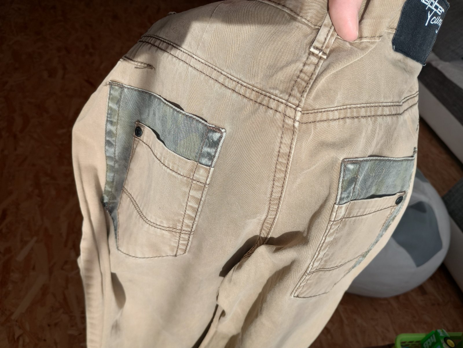 Malo nosené, na jednej nohe vzadu chybička. Akoby šuchnute, je to od nova. Viď hlavnú fotku. Chýba gombík. Farba skôr piesková, ako na poslednej foto.