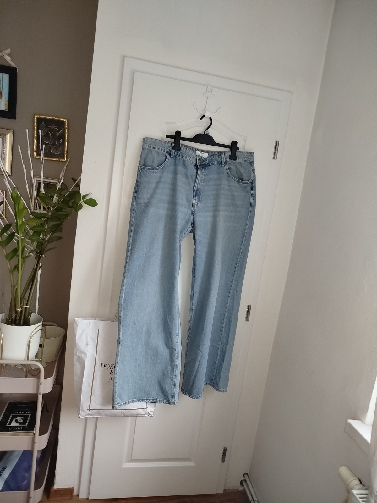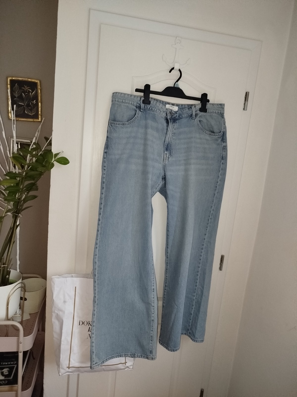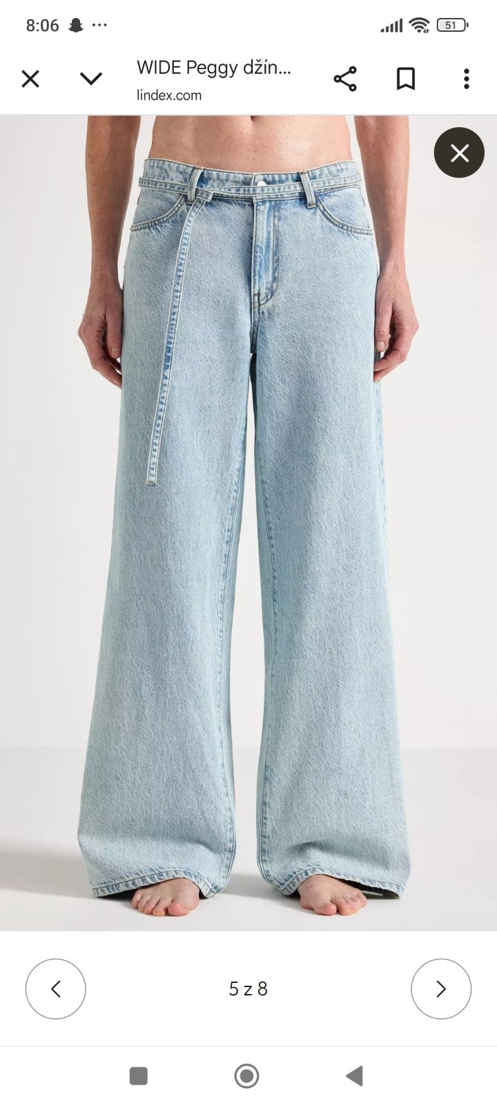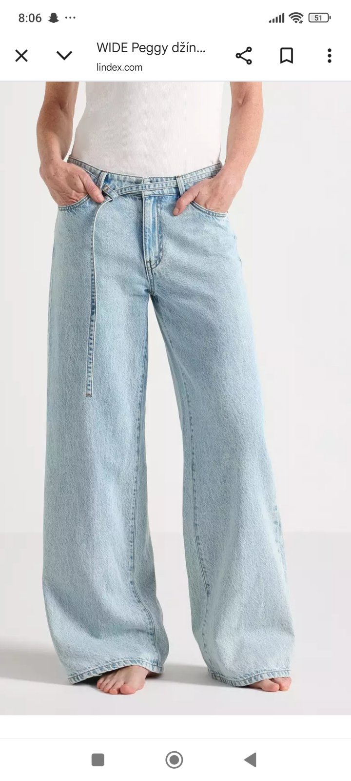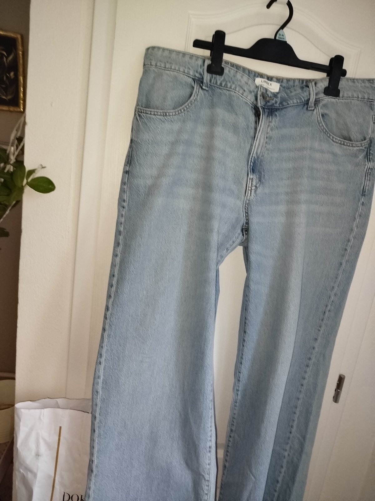 Moderné aktuálne široké rifle Lindex wide bez elastanu dĺžka 112cm,pás 52x2cm, boky 63x2cm,spodok 33x2cm. Sú perfektné dobre robia postavu zakryjú nedostatky,mne sú už veľké .nevyzerajú dobre na mne.Pc 59.99eur