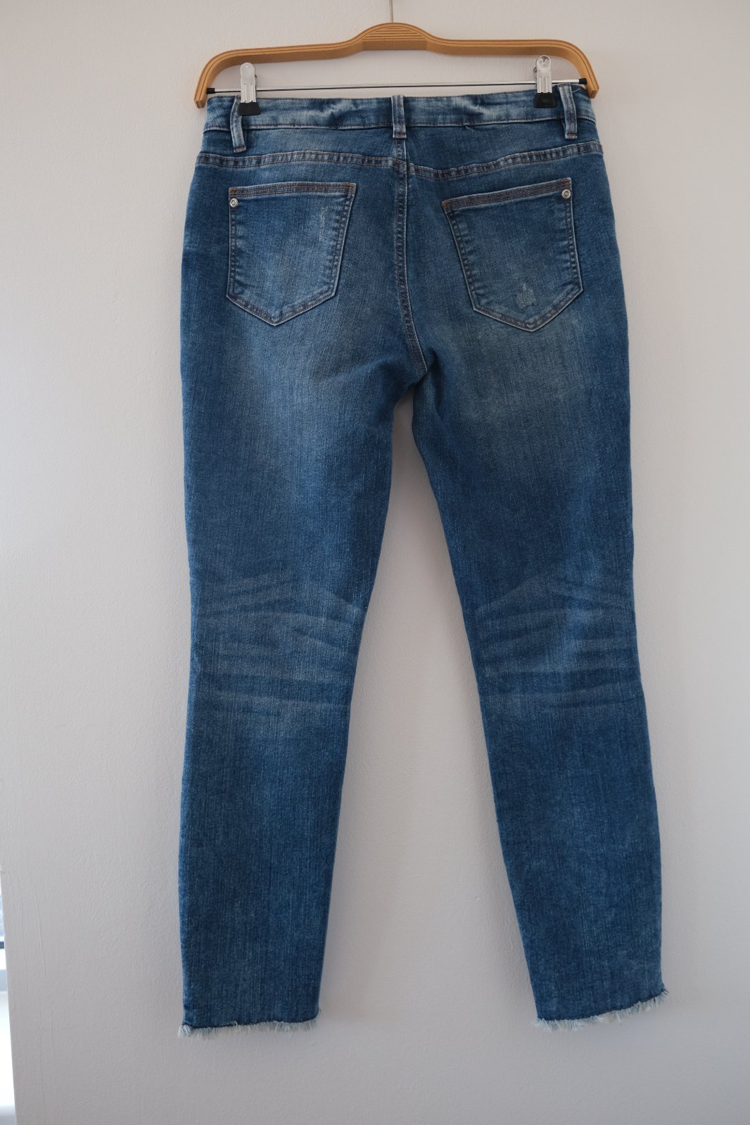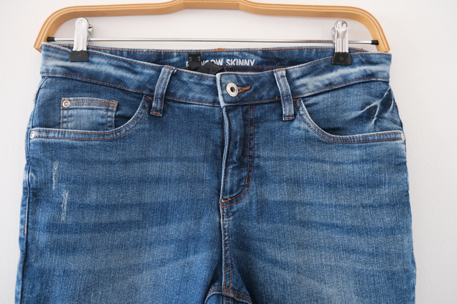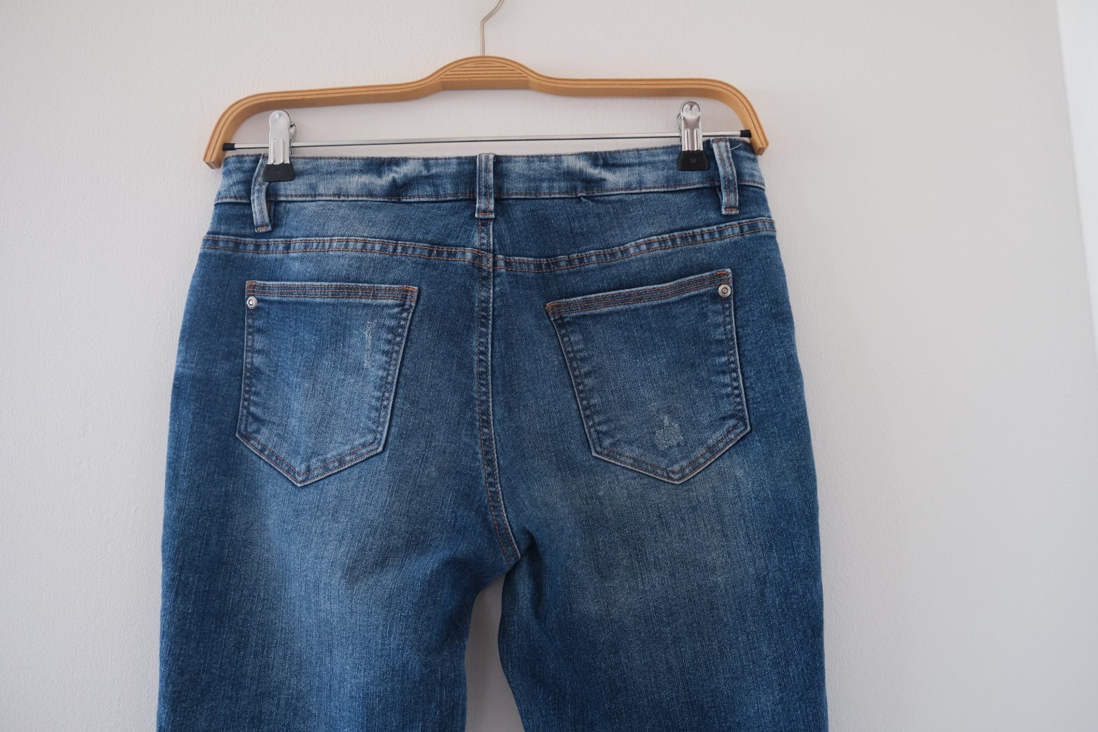 🛒 Rifle č.4 „Dámske rifle, rovný/slim strih, mierne elastické, tmavomodré, s jemným roztrhaním na kolenách, moderný strih.“
