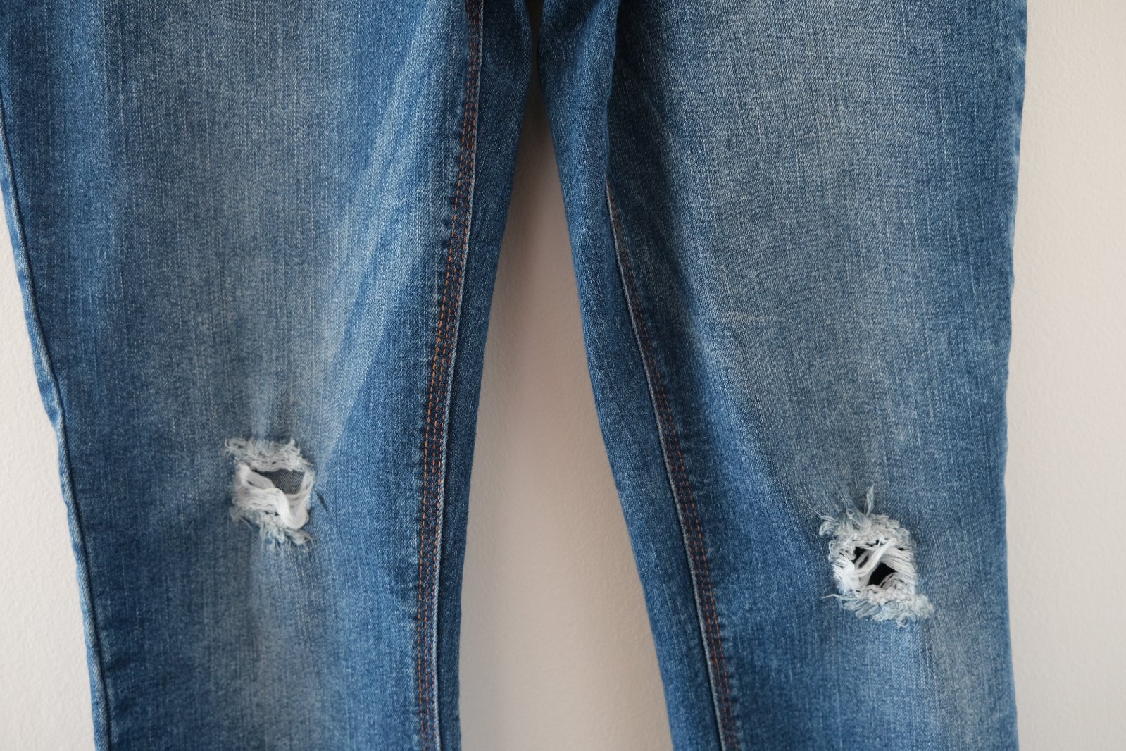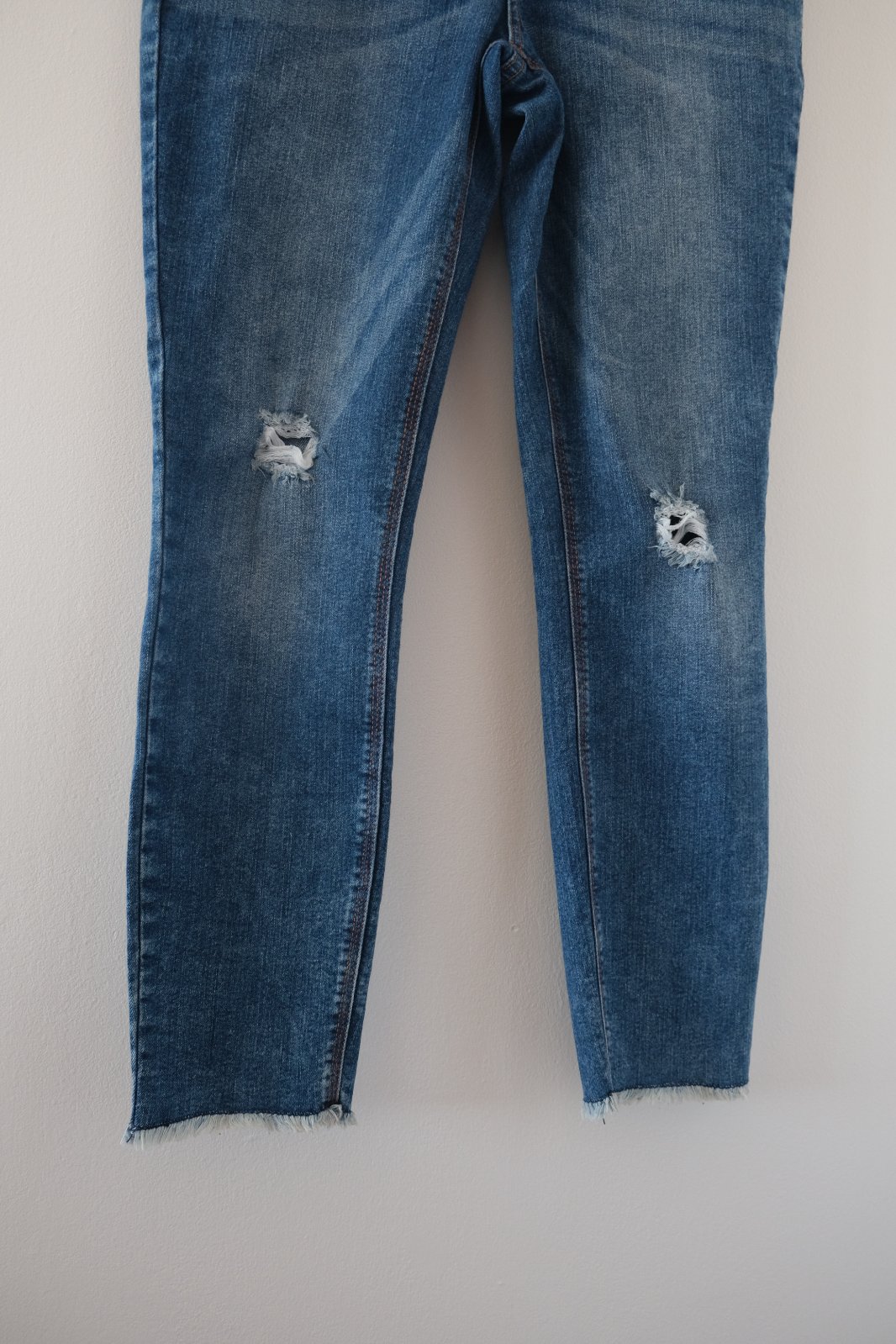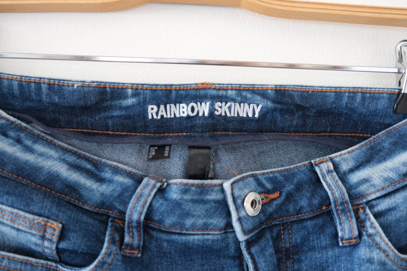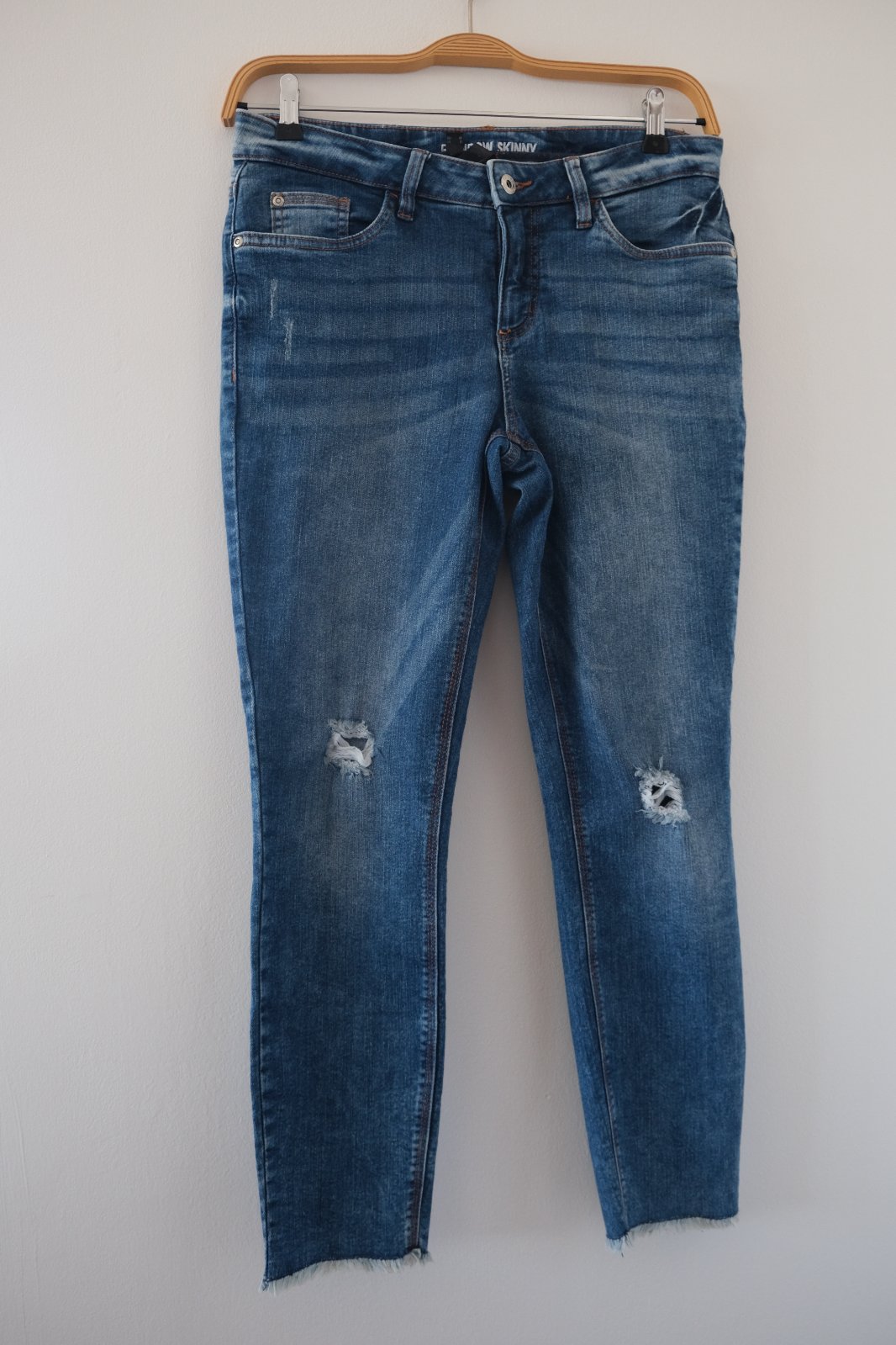 🛒 Rifle č.4 „Dámske rifle, rovný/slim strih, mierne elastické, tmavomodré, s jemným roztrhaním na kolenách, moderný strih.“
