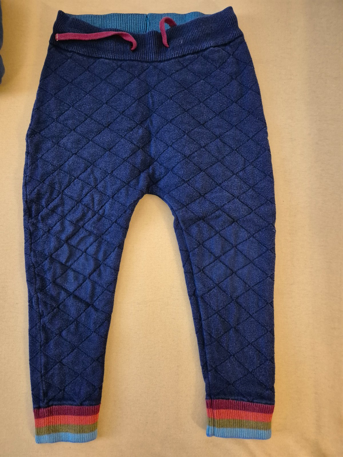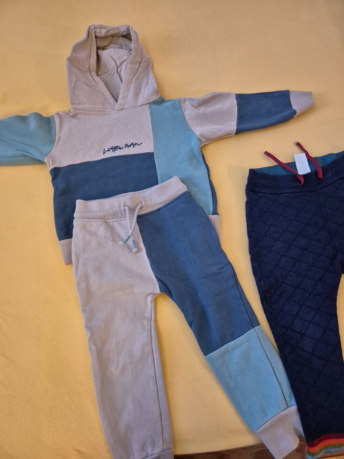 1ksTeplakova suprava zn.Next. Noseny stav,praci chlpok .Na teplakoch mala dierka na kolene( vid foto) sikovna mamina zasije. 1ks teplaky tmavo-modre z farebnym lemom na spodu-teplejsie zn.Next (bez poskodeni) . Teplaky su vhodne pre chudsie dieta.