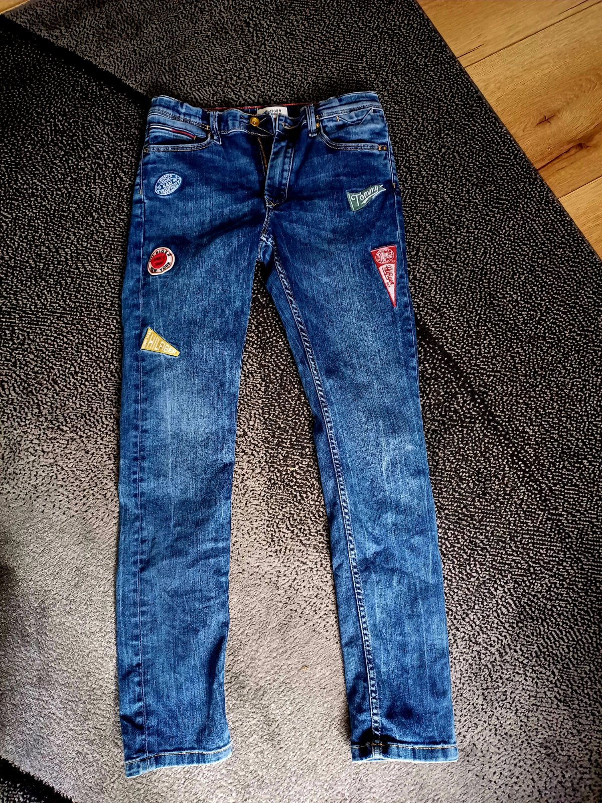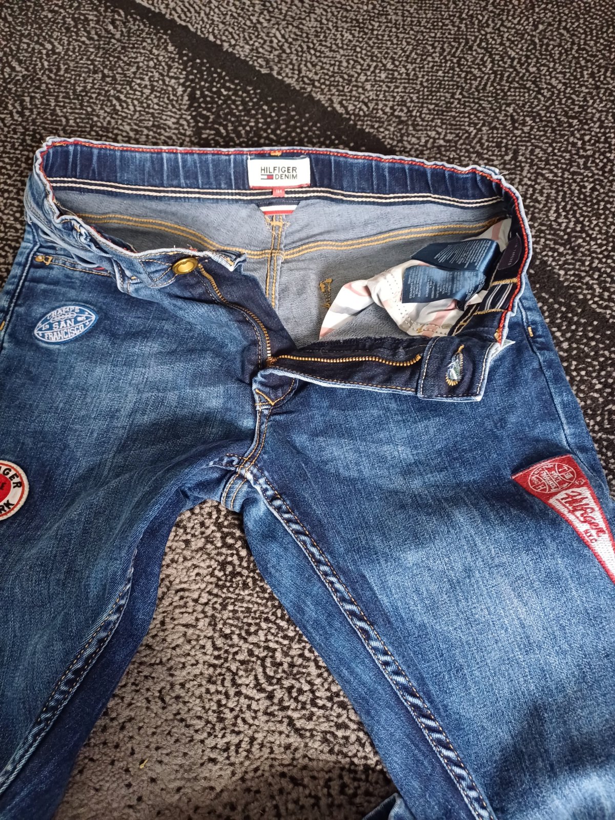 Krásne chlapčenské rifle Tommy Hilfiger príjemnej šedej farby. Boli nosené na striedačku s inými, sú stále krásne a bez závad. Na troch miestach sú ako keby vyšúchané (viď foto), ale tak boli origi...