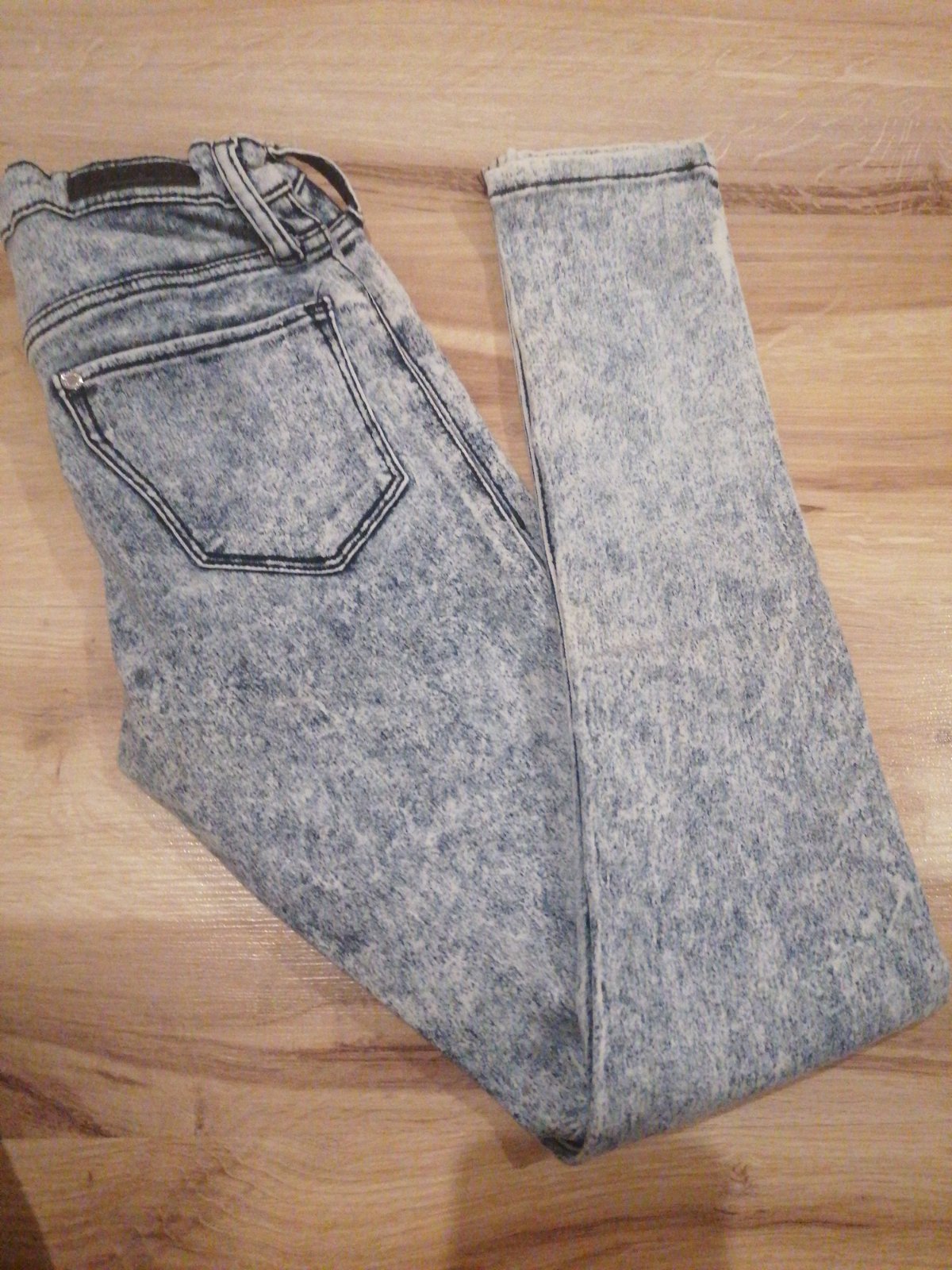 Elastické svetlošedé rifle, dĺžka 80 cm, šírka pásu 30 cm, regulovateľný gumičkou. Na kolene jeden slabý fľak a na jednej nohe na spodku pár slabých fľakov