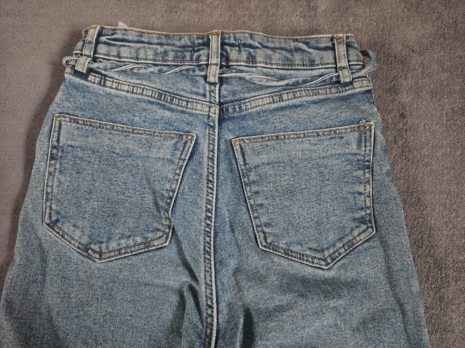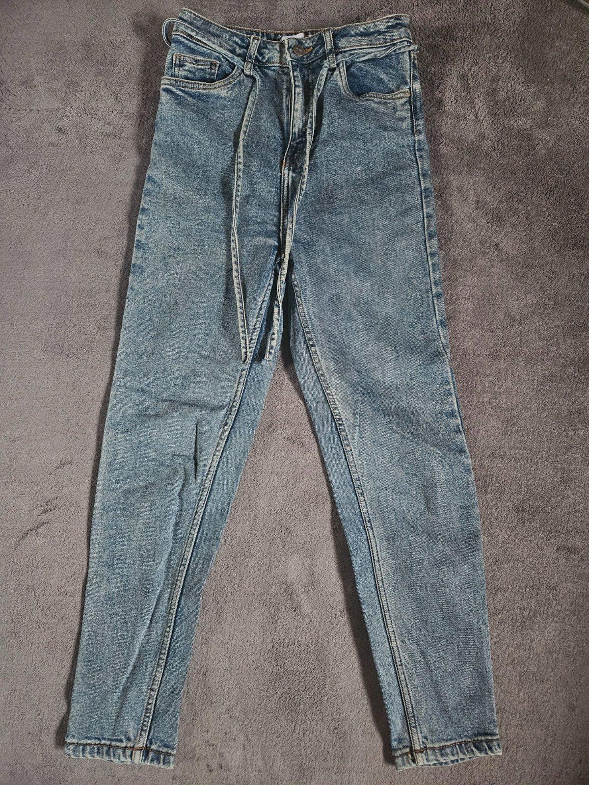 Tmavomodré rovné džínsy s vysokým sedom. Veľkosť 32/22. Dĺžka 109 cm, pás 34 cm a boky 47 cm.