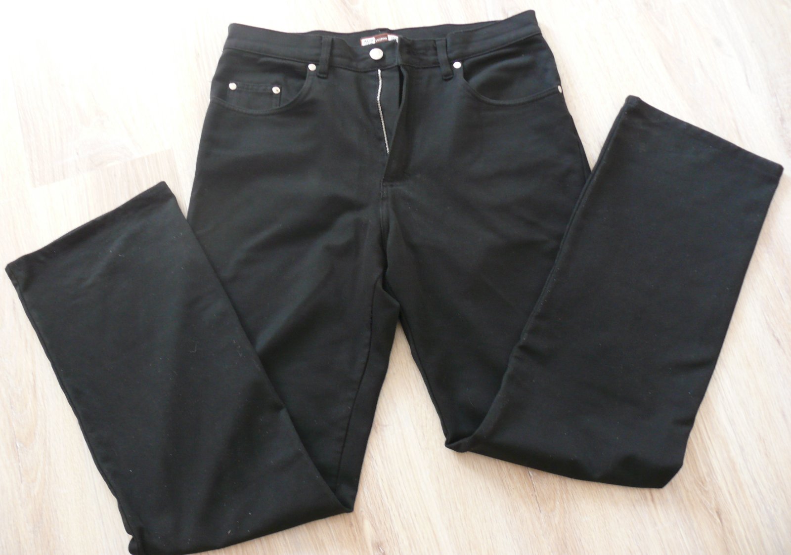 Perfektny stav, sú kvalitné, netreba ich ani zehlit a sú pohodlné. Dl.116, v rozkroku 85, pás v klude 2x42 az do 47 cm, boky 2x55, sírka úplne dole 23 cm. Posta doporucene 3,50€.