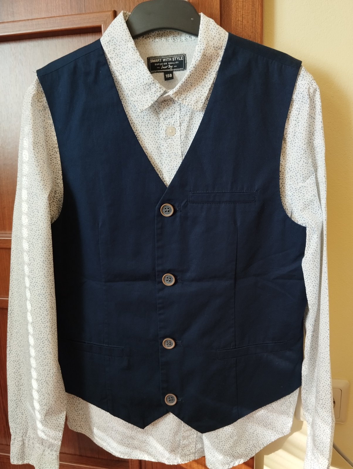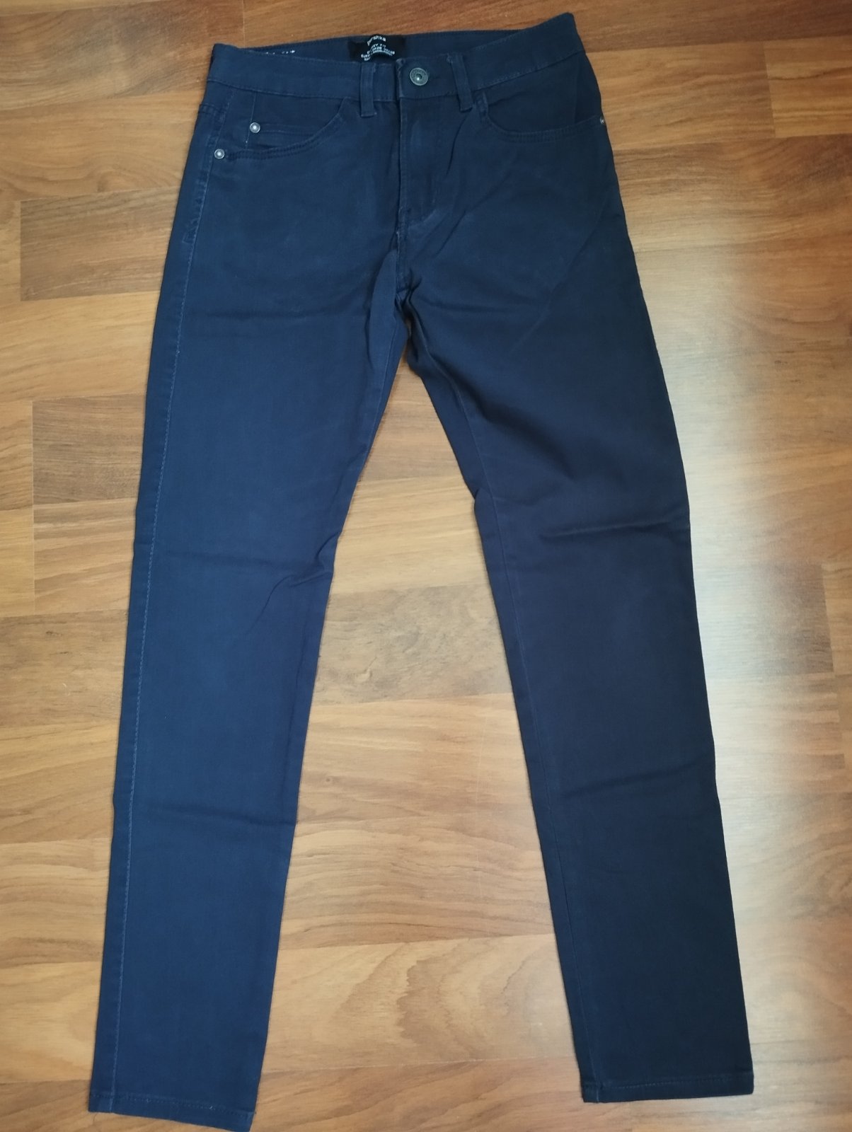 Pekný nosený stav, číslo Eur34, skinny fit, úzke, u nás syn nosil ako 158-ku s kompletom košeľa s vestou, ktorú mám v ponuke. Mierne elastické, dĺžka=93cm, pás=2x34cm