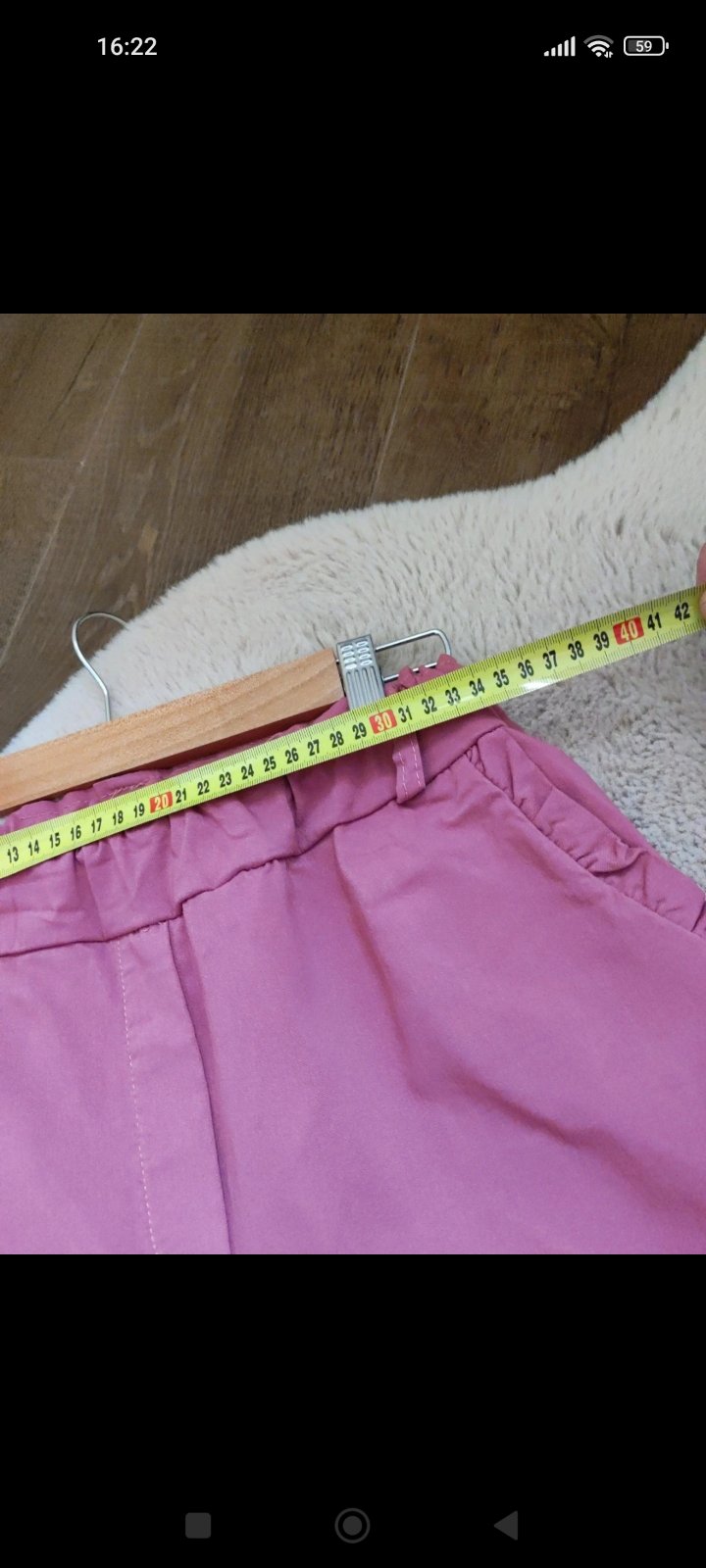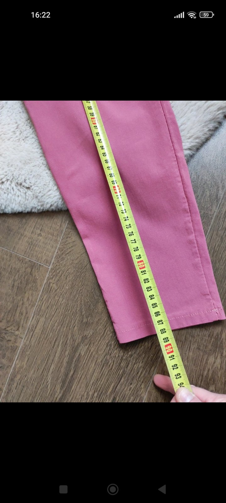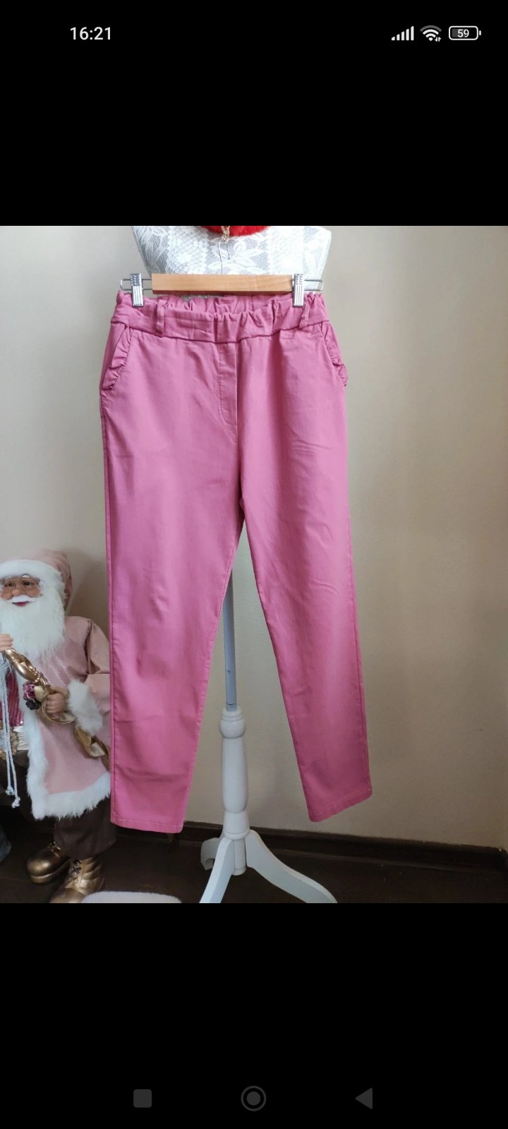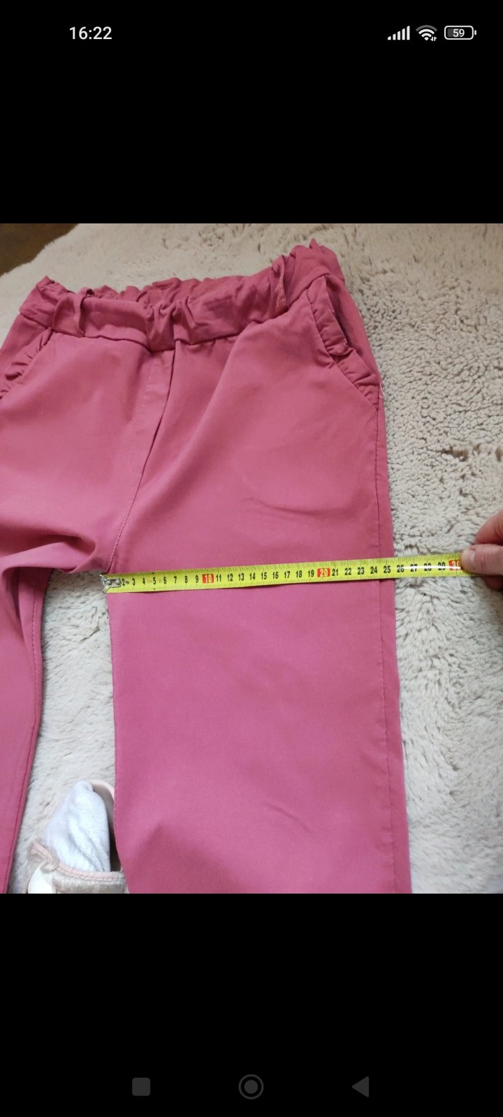 1x oblečené, veľkosť je univerzálna, elastická, dajú sa vyhrnúť a nosiť ako trojštvrťové nohavice. Dľ.92cm, š. v páse 35-54cm, obv.bokov 46cm, obv. cez stehno 24cm