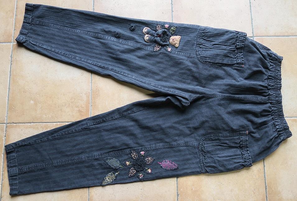 Predám vtipné domáce nohavice. Bezchybný nosený stav. Veľkosť 38/42. Voľný pohodlný strih, pás na gumičku. Materiál: 100 bavlna s aplikáciami – na jednej strane – macík, na druhej kvetinka. Vpredu dve vrecká. Vzhľadovo materiál pripomína spranú čiernu riflovinu.