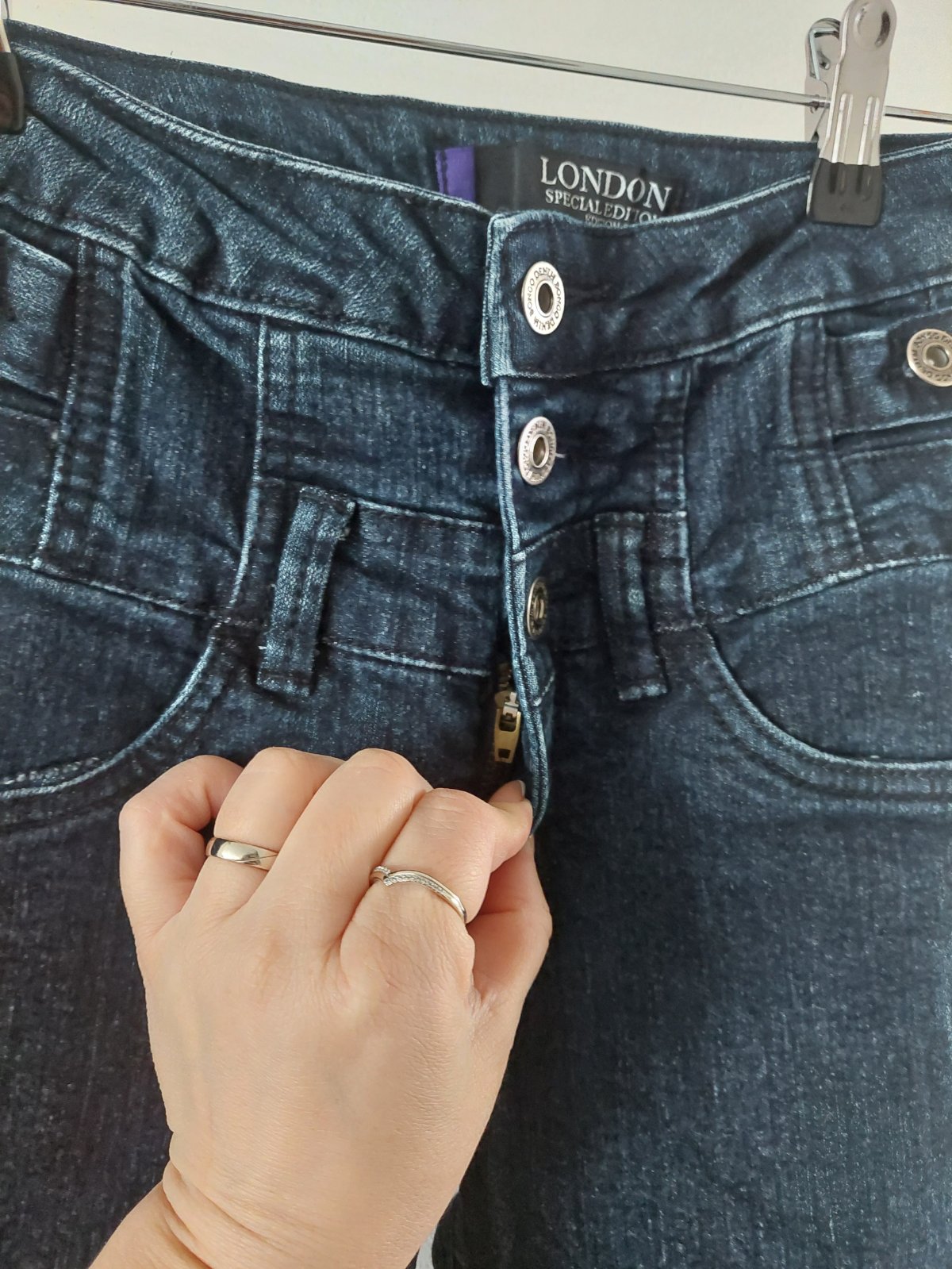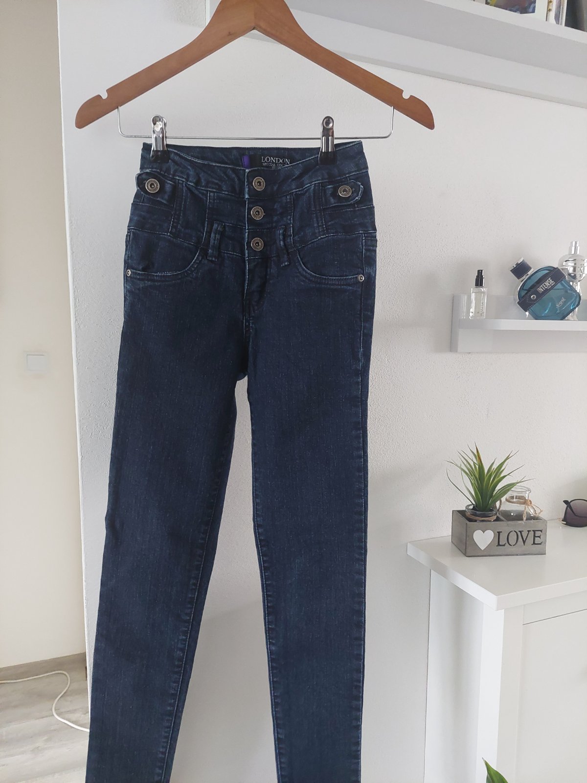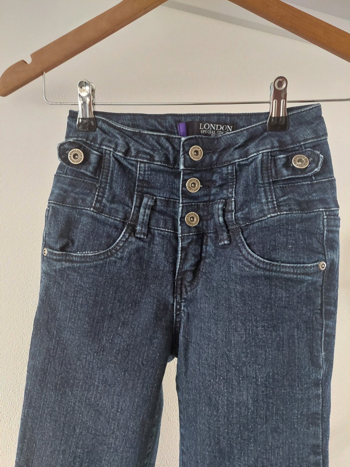 Predám tmavomodré rifličky veľ. XS oblečené pár krát v super stave s vysokým pásom na gombíky, veľkosť nie je písaná už tam nie je štítok ale zodpovedajú XS, v prípade záujmu pomeriam cena 5€ + poštovné