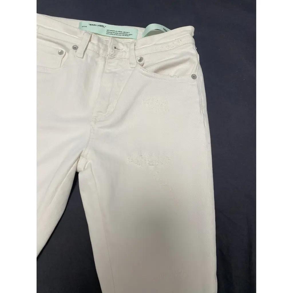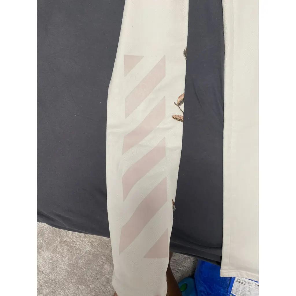Módna značka Off-White so sídlom v Miláne bola založená v roku 2013 DJ-om a módnym návrhárom Virgilom Abloh a jej cieľom bolo preklenúť priepasť medzi streetwearom a vysokou módou. Tieto džínsy z bieleho denimu v farbe ecru kombinujú drsné roztrhnutia a roztrhané okraje s jemnou kvetinovou výšivkou na jednej strane. Majú päť vreciek, zapínanie na gombík a zips, rovný strih nohavíc, vyšívaný kvetinový vzor, efekt opotrebovania a roztrhané okraje.