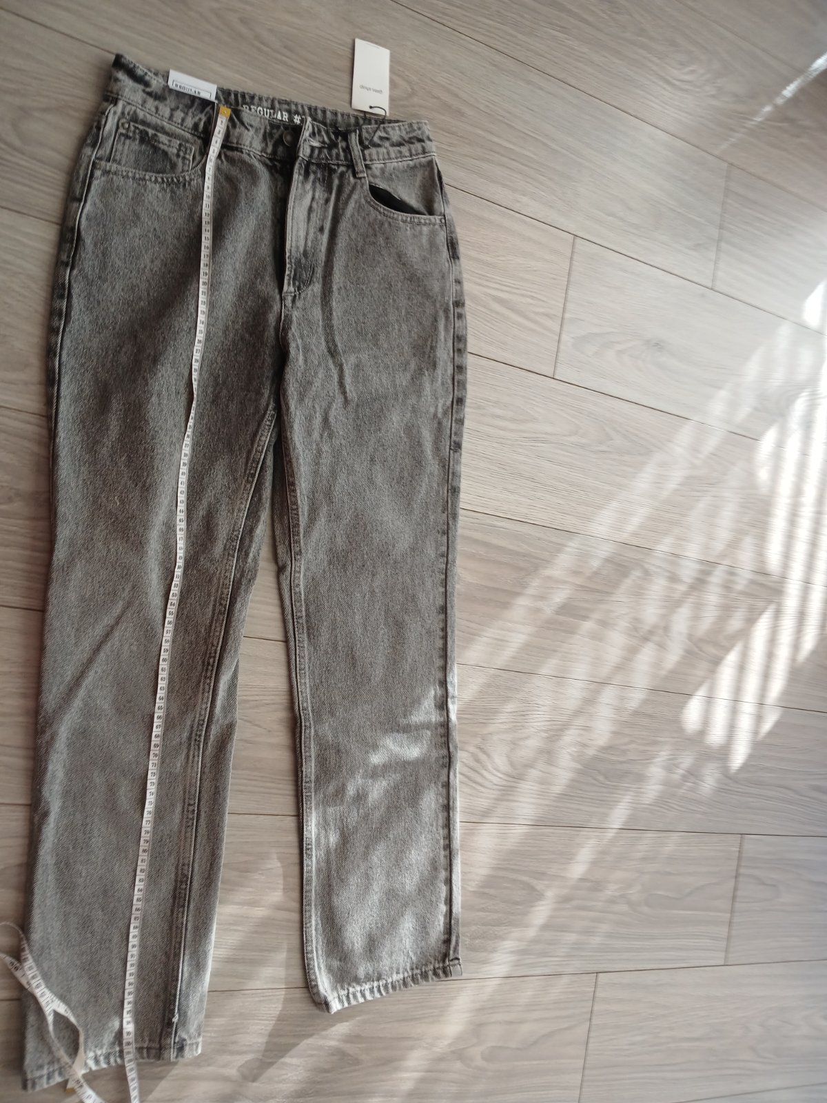 Bez poskodeni, vyšší pás Dlzka od pasu 98cm, obvod pasu max 76cm, obvod nohavice v celej dlzke rovnaky 50 cm.