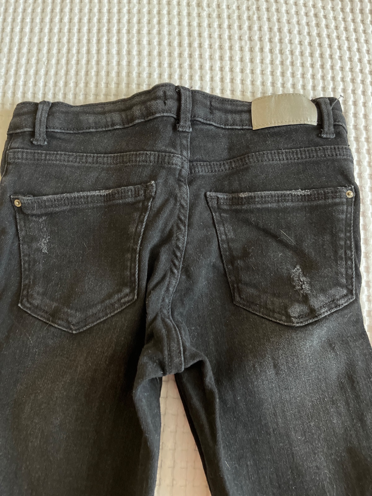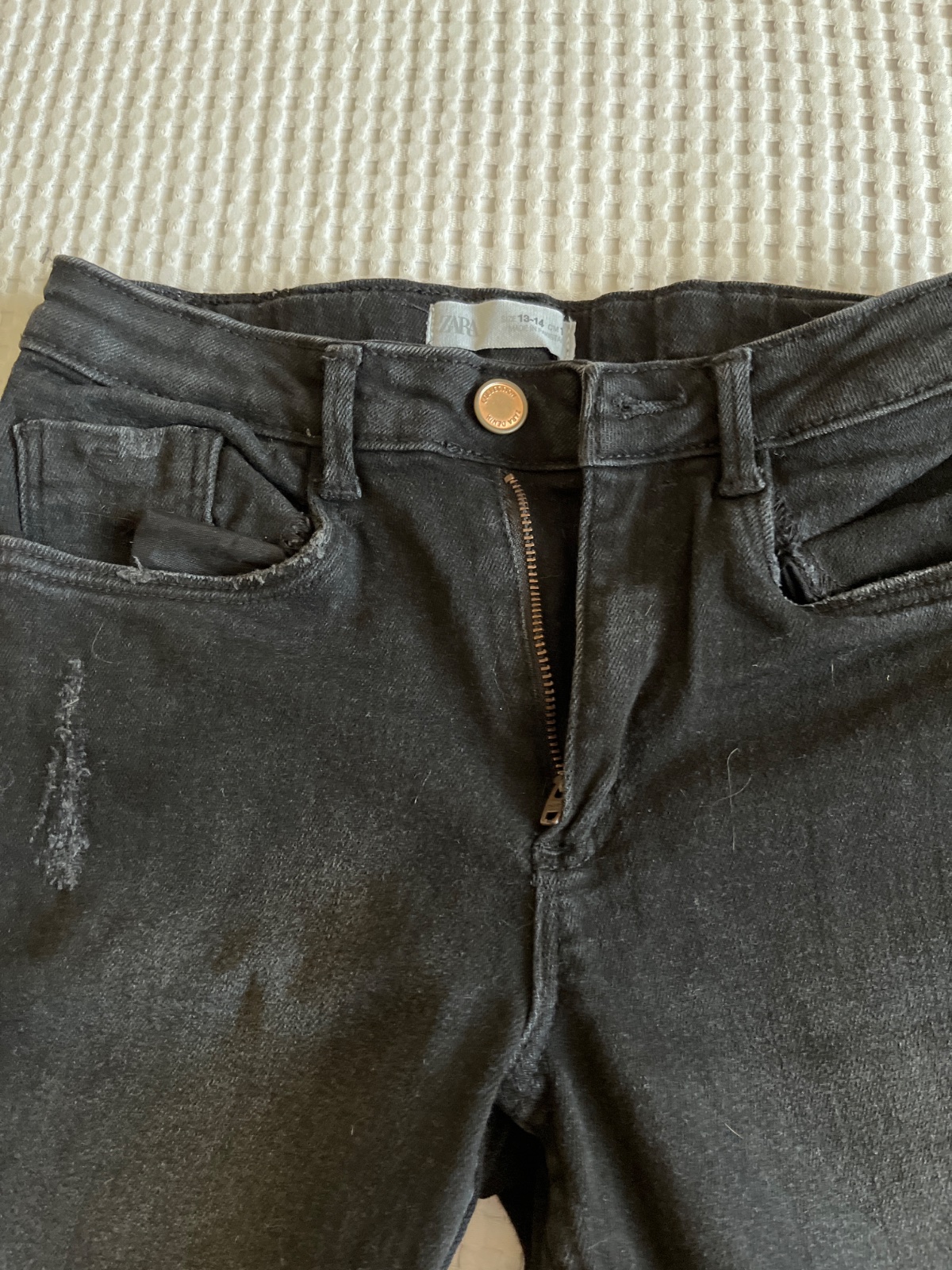 Zara čiernošedé slim rifle - džínsy, v páse pružná posuvná gumka s reguláciou, vrecká vpredu aj vzadu, vzadu zariahnutá nitka, pozri detail, inak výborný stav bez poškodenia, veľ. 164