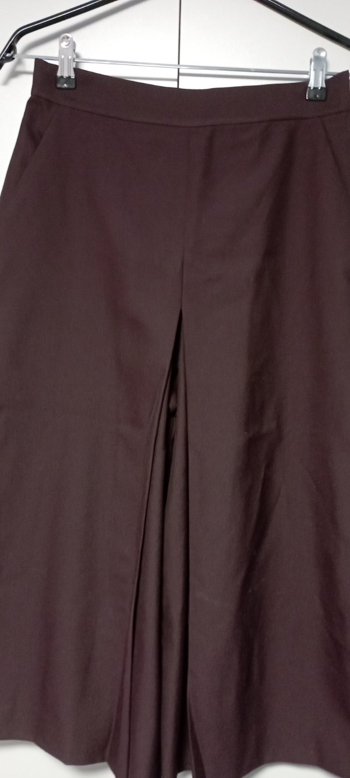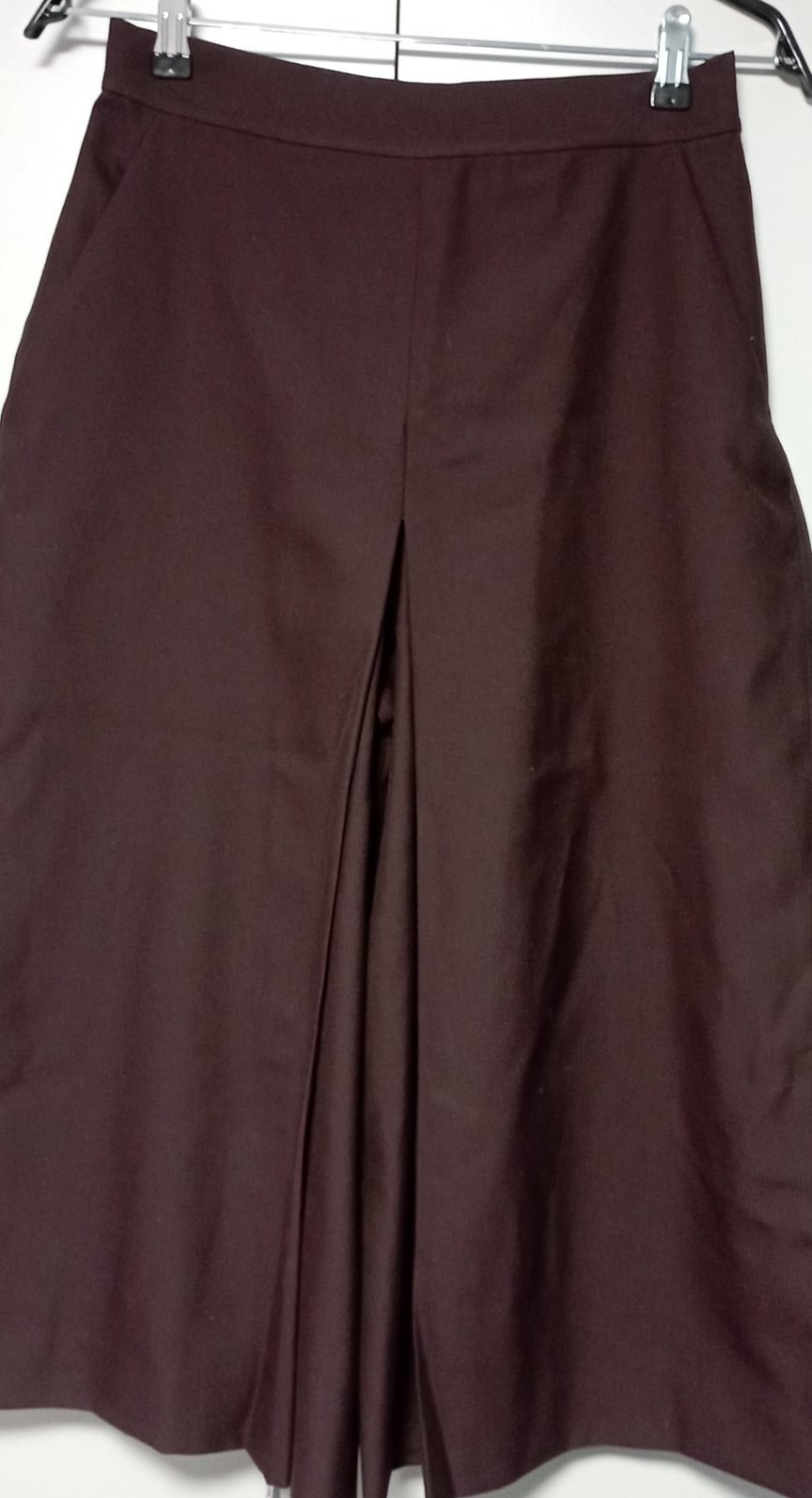 široké 7/8 nohavice so stredne vysokým pásom zo spriadanej viskóznej zmesi, bočné vrecká., predný plisovaný detail so zapínaním na skrytý zips. vo modernom farebnom prevedení burgundy, v bezchybnom stave,