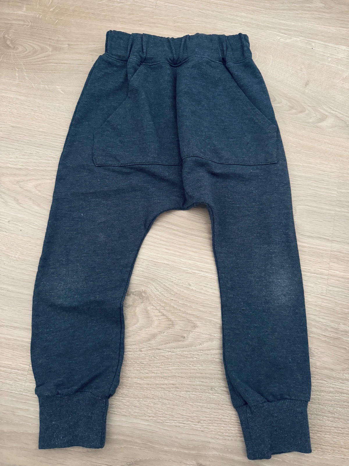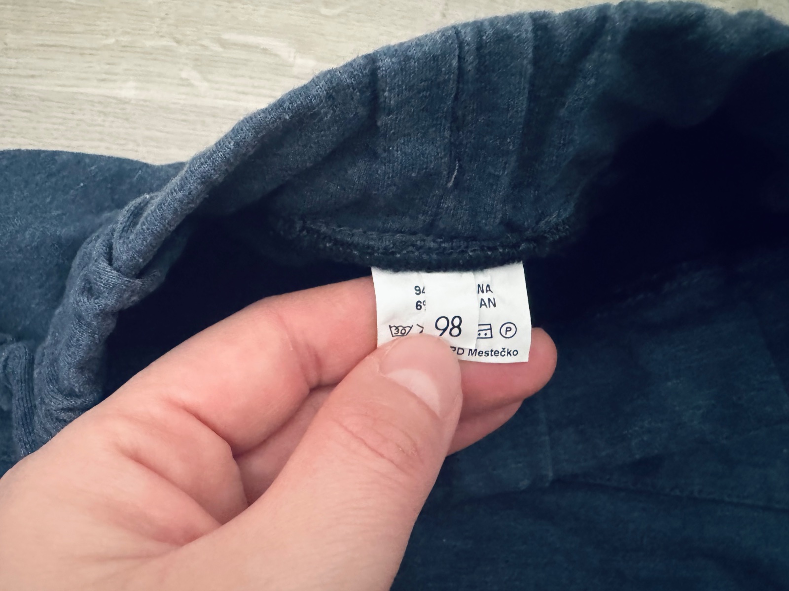Modré melírované tepláky šité na Slovensku - PD Mestečko, veľ. 98, iba párkrát oblečené, majú však šuchnuté kolienka, viď foto