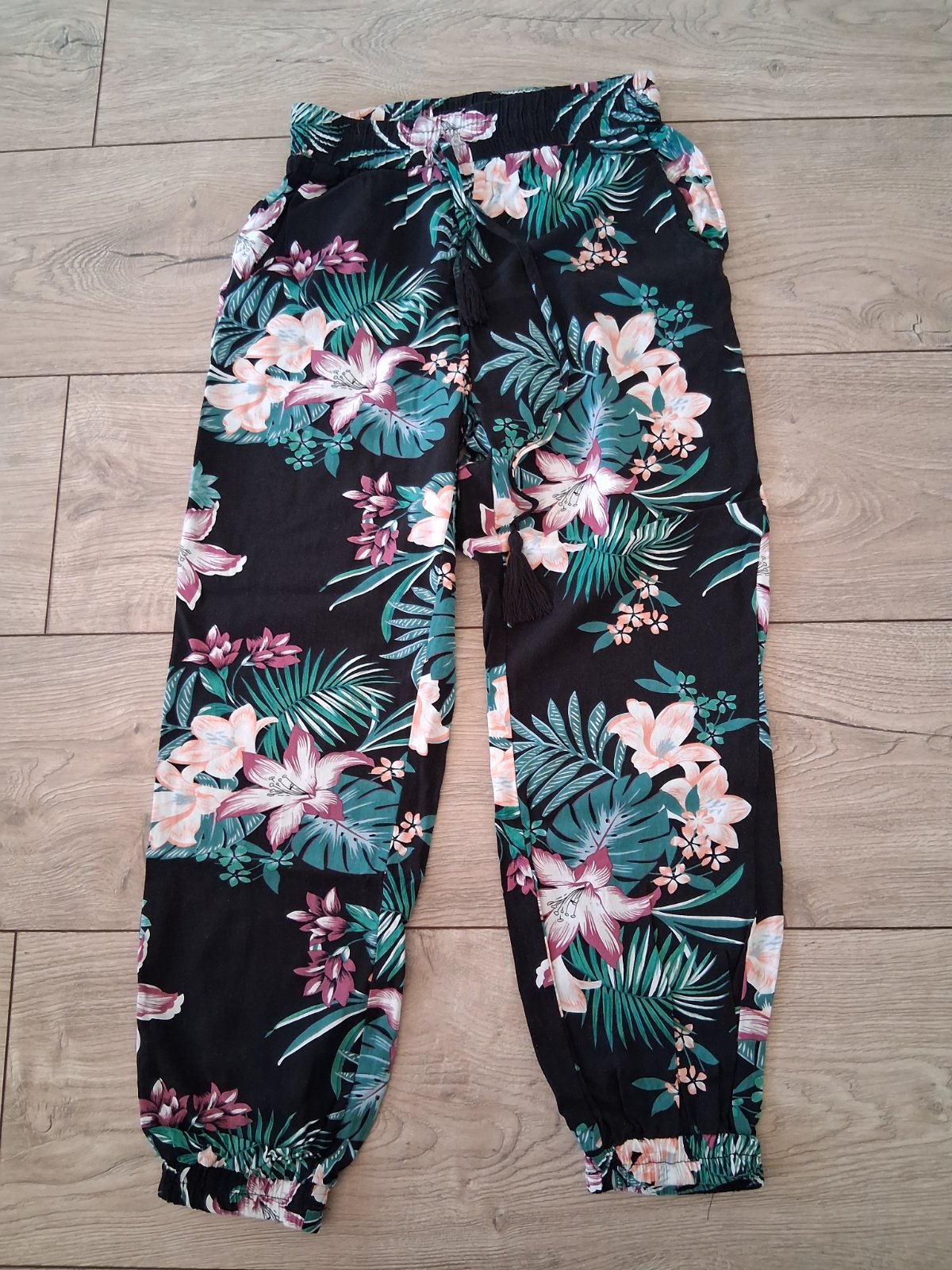 Krásne kvietkované letné nohavice z úplne ľahučkého vzdušného materialu. Pás je na gumu+ dá sa dotiahnuť šnúrkou, spodok nohavíc je tiež na gumičky. V prípade záujmu mám aj dospelácku veľkosť pre maminku.