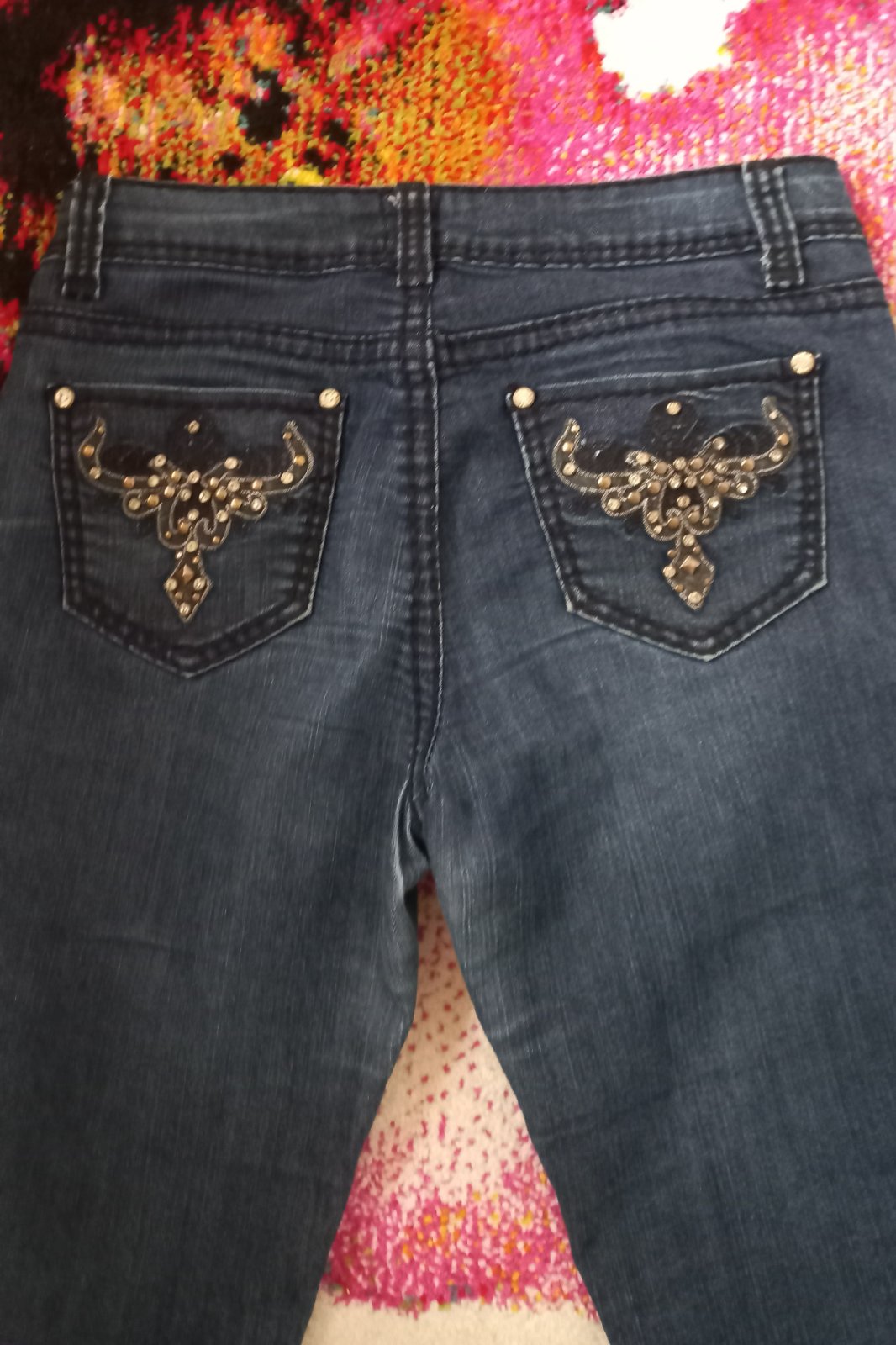 Rozmer pás 38 cm, boky 48 cm. Dámske rifle rozšírené, na zadných vreckách aplikácie. ZN: 2b bebe. Treba sa zmerať. Na štítku veľkosť 28 .