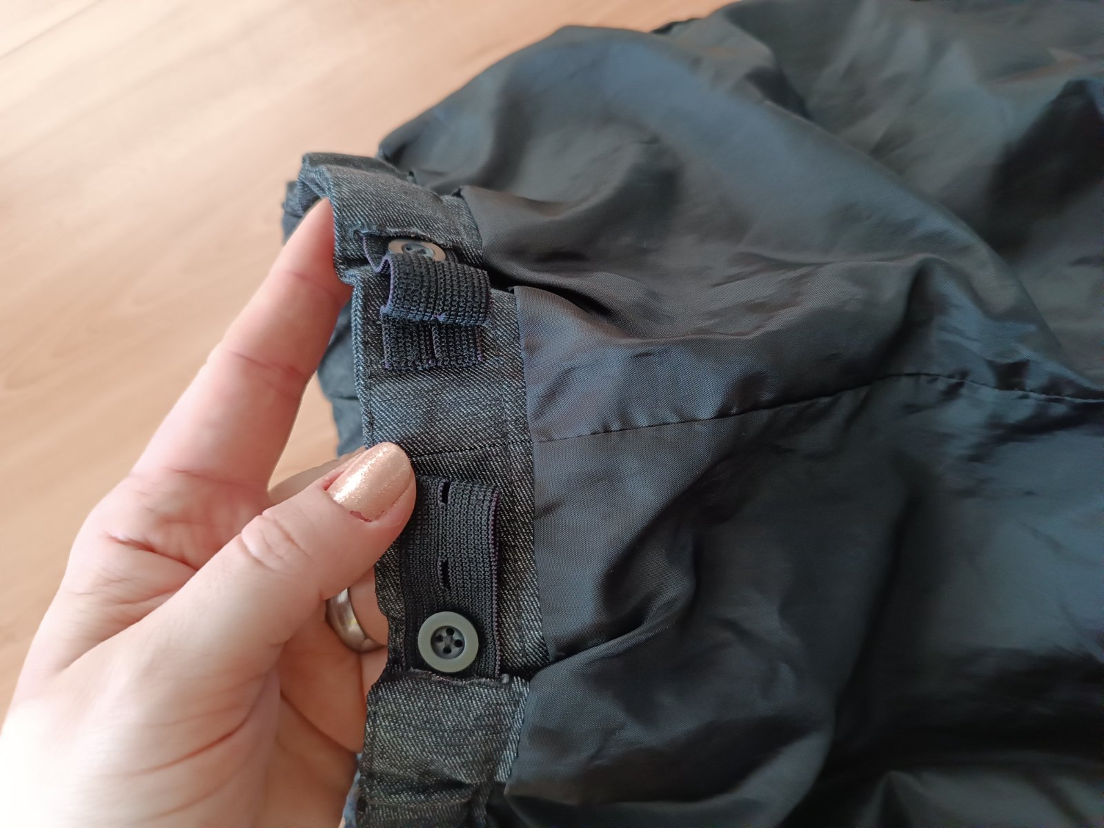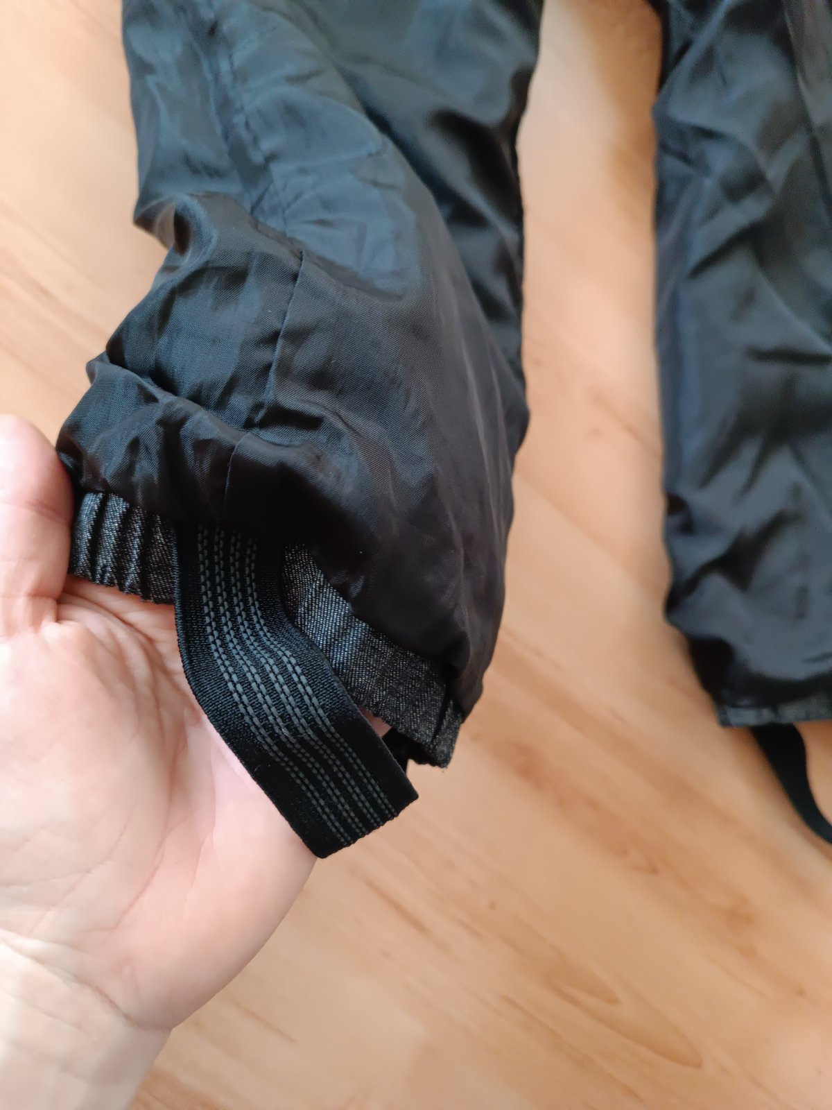 Nohavice . Vhodné do sychravého počasia . Na tepláky alebo hrubé pančuchy. Na spodu guma, v páse regulovateľná guma. Bez dier či fľakov . Nezateplené.