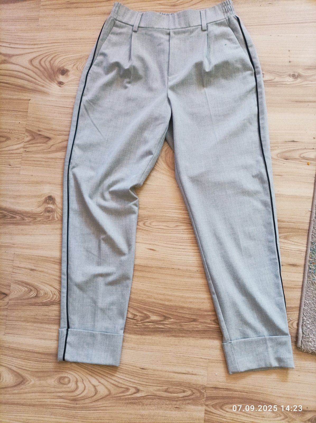 7/8 nohavice s lampasami po stranách vo výbornom stave bez poškodení. Pás na gumu, v pokojnom stave 60 cm, dĺžka nohavíc 85 cm.