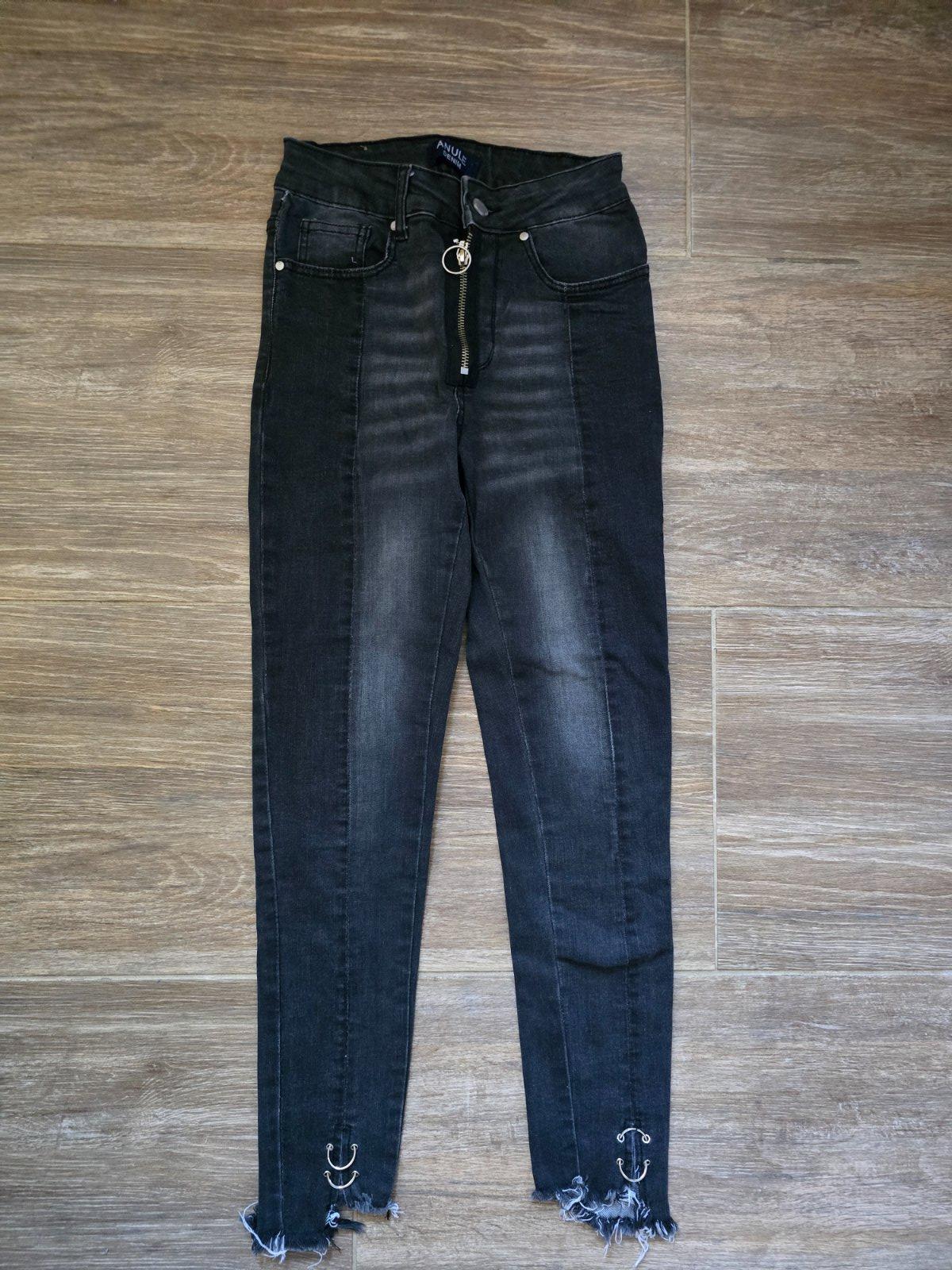 Čierne rifle, nosené, ale veľmi pekný stav. Veľkosť je písaná 35. Dĺžka od rozkroku dolu je 68cm. Pás 35cm Nie sú elastické.