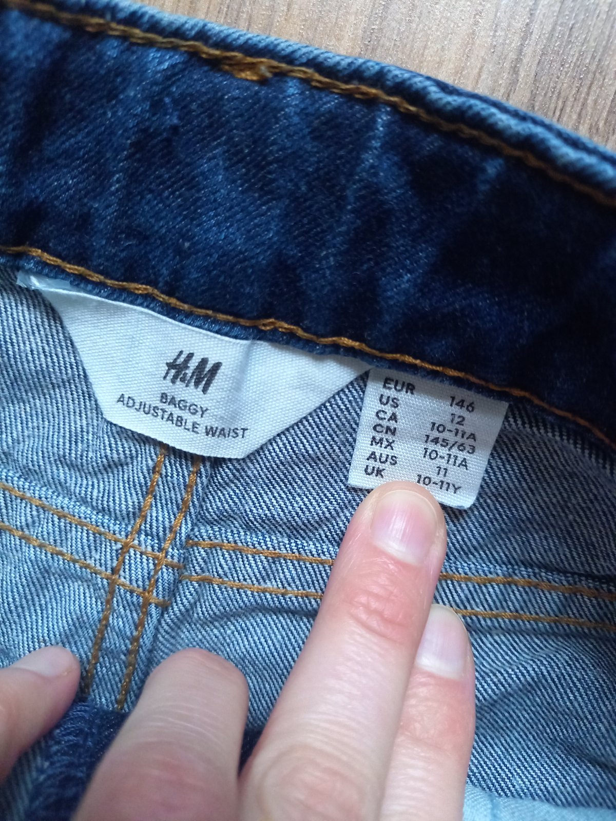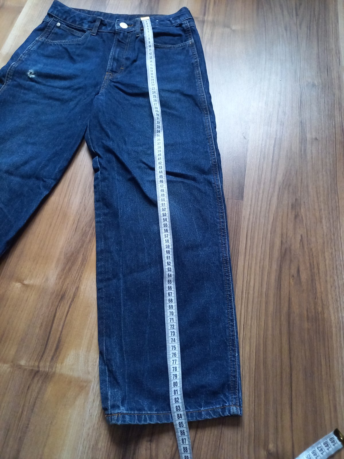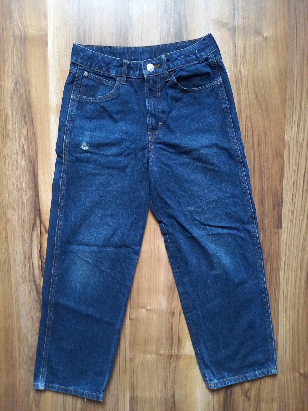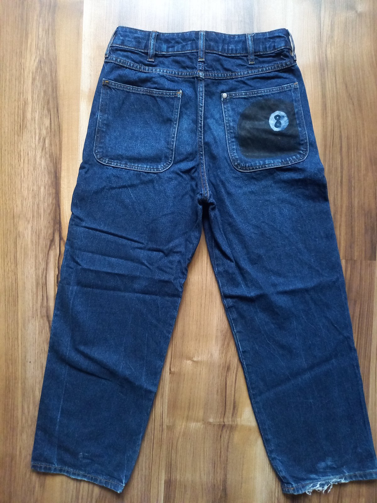 Ponúkam chlapčenské nohavice zn. H&M, široký strih, veľkosť 146. Tmavomodrá riflovina. Dve vrecká vpredu, dve vrecká vzadu. Malá vydratá dierka vpredu, jedna nohavica tiež vyšúchaná vzadu naspodku. Na zadnom vrecku ručná maľba- guľa čierna osmička. Na fotkách sú rozmery.