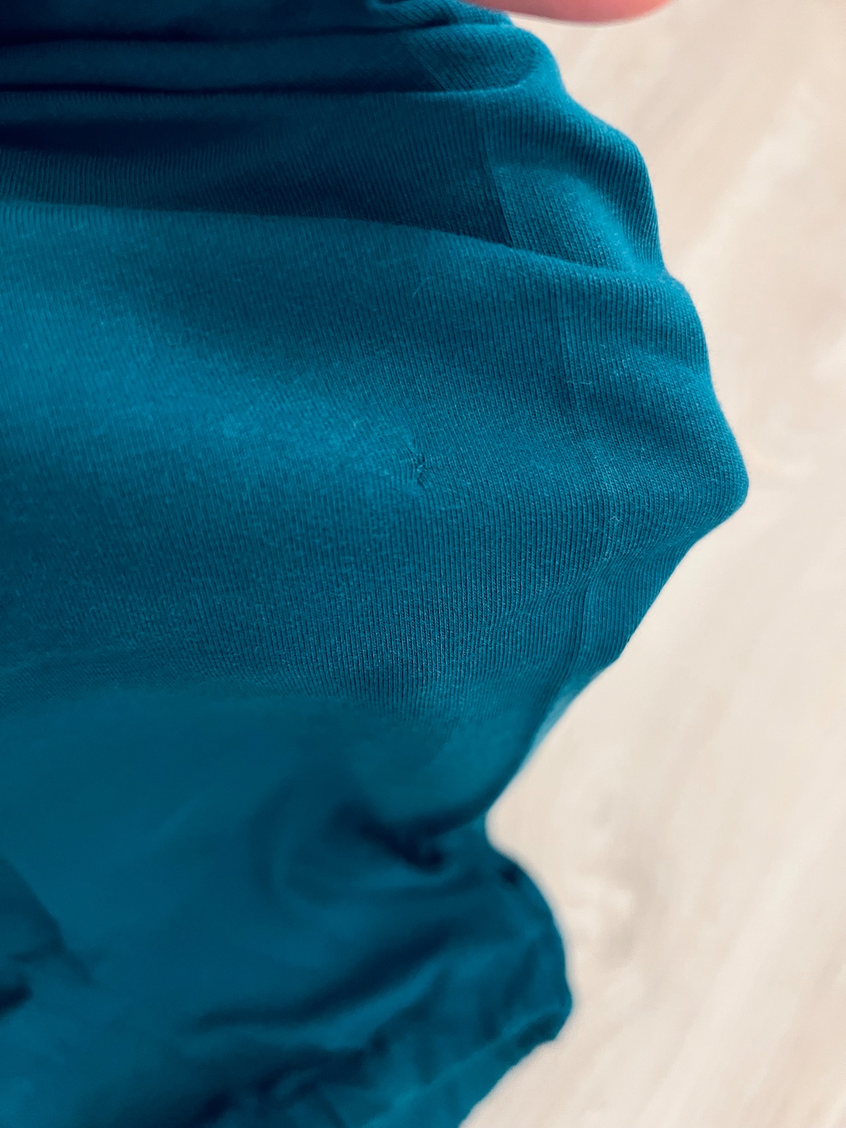 Petrolejové nohavice slovenskej značky oli&oli 104 majú trošku šuchnuté koliienka a jednu malú dierku zašitú, viď foto