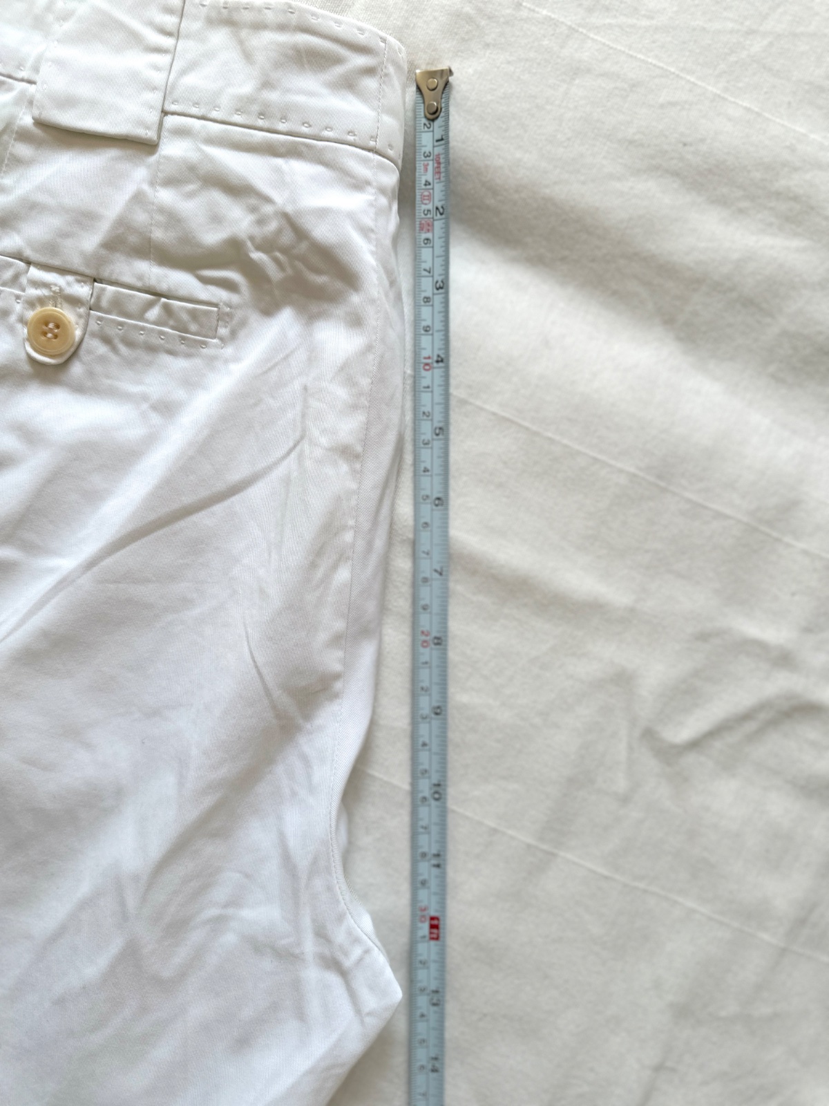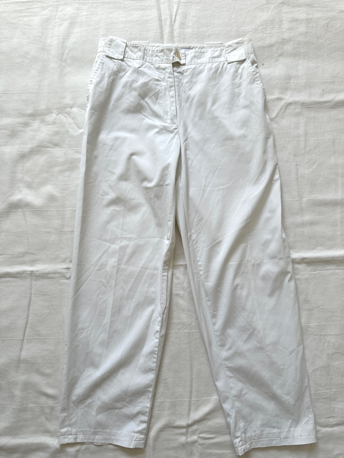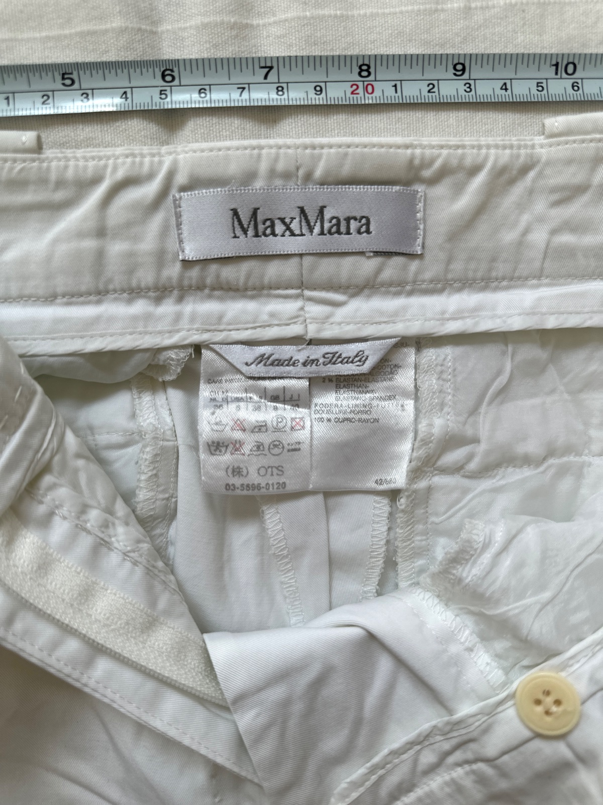 Tieto biele nohavice sú vyrobené z vysoko kvalitnej bavlny. Materiál je hrubší,nie je priesvitný, ma tiež jemný lesk a jemné rebrovanie. Sú vyrobené s dôrazom na detail. Sú vyrobené z 98 % bavlny a majú podšívku zo 100 % Cupro materiálu na vreckách. Majú bočné vrecká, stredne vysoký pás. Ideálne na rôzne príležitosti, športové aj elegantné. Nové, cena je približne 160 €. Veľkosť na etikete je 36/38; všetky miery sú na fotografiách.