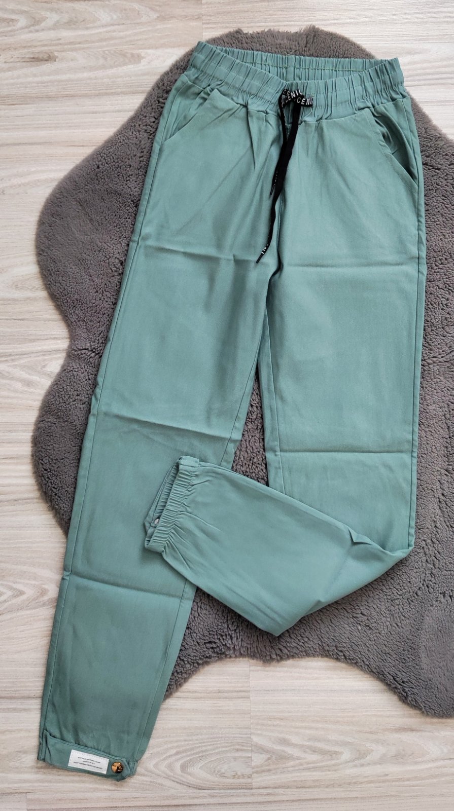 Nohavice elastické, v páse gumička, nie je uvedená veľkosť, ale je to skôr S. Zloženie 65% bavlna, 30% acrylic a 5% spandex. Pás 33 cm, dĺžka 94 cm. Vzaté asi 2x. Farba skôr ako na 3 foto. Kuk aj o...
