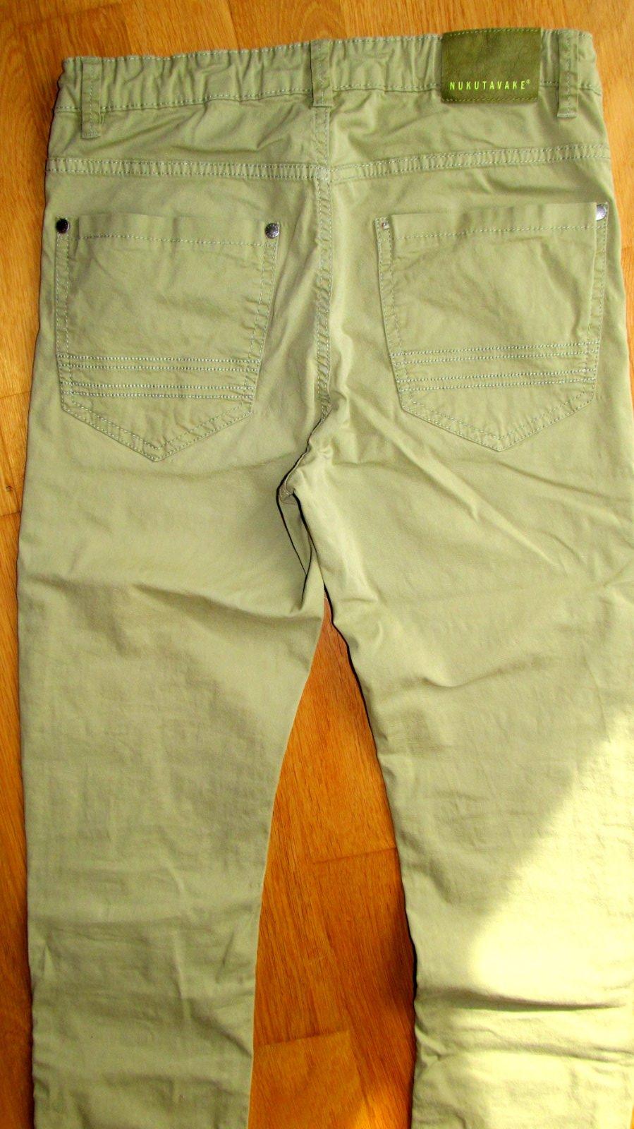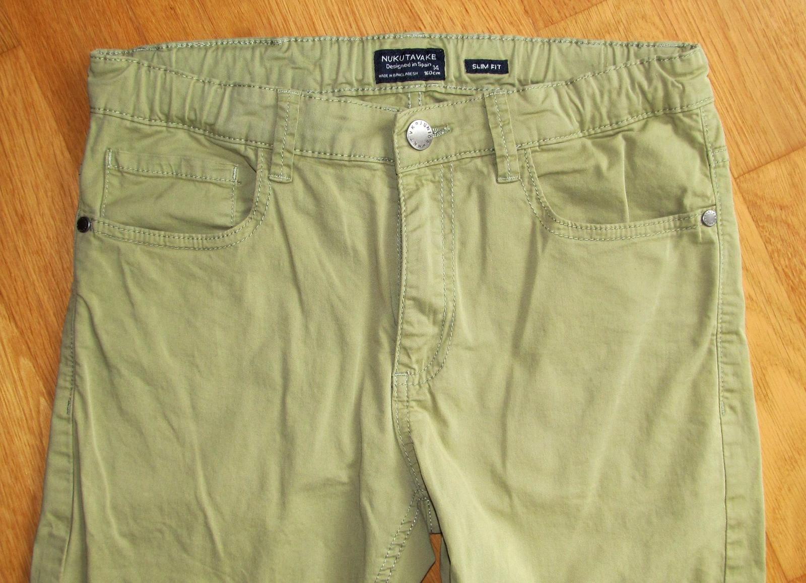 zelenkave tensie (jar/leto) nohavice s primesou elastanu a nastavitelnym pasom pre chudsich chlapcov alebo ako slim fit strih. Parkrat nosene, ale zo zadneho vrecka odpadol 1 ozdobny cvok, inak su vo velmi peknom stave. Farba nie je maskacova, ale svetlozelenkava. Material bavlna, velmi pekne detaily na vreckach. Dlzka na boku 93 cm, pas v klude 2*35, natiahne sa cca do 37,5, da sa stiahnut nastavitelnou gumou v pase.