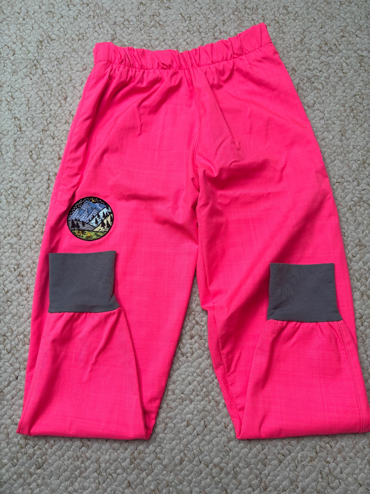 Nohavice som sila ja. Nie som krajčírka čiže sú naozaj len také že po domácky. Ten vrch je trošku zle zošity, ale noseniu nebráni. Inak bez flakov či dier. Farba neónova ružová. Veľkosť tak 146.